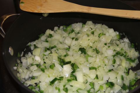 While the onion is cooking, chop the bell pepper and then add to the pan, along with the chili powder (note: if you’re using the same knife to chop everything, remember that the residue from the jalapeno will transfer to the bell pepper and burn your mouth if you try to eat a piece. And if you forget and try to eat another piece, it will happen again)