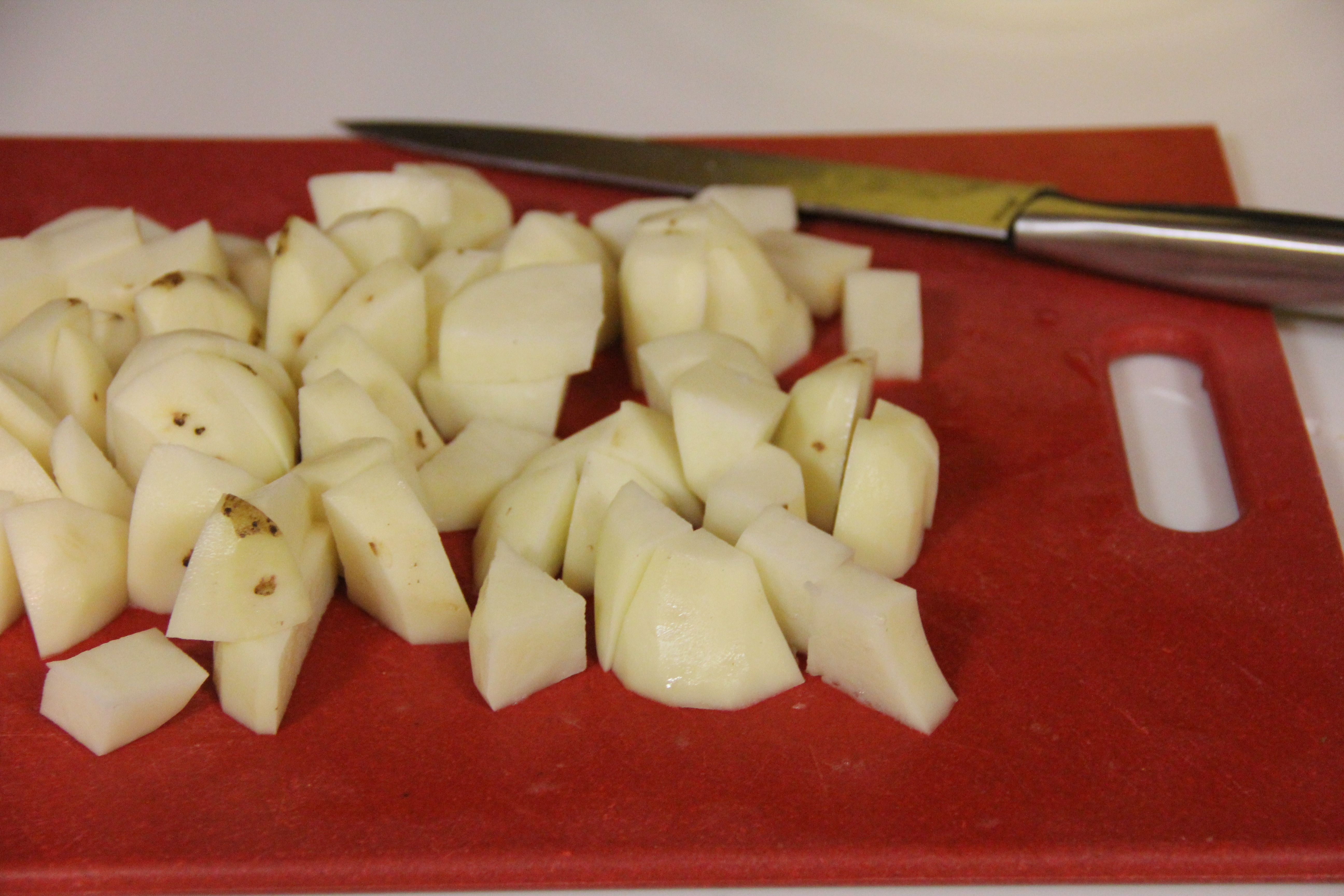 Note: be sure to cut the potatoes into evenly-sized pieces so that you don’t end up with some pieces that are overcooked and others that are undercooked. Also, the smaller the pieces, the faster they will cook.