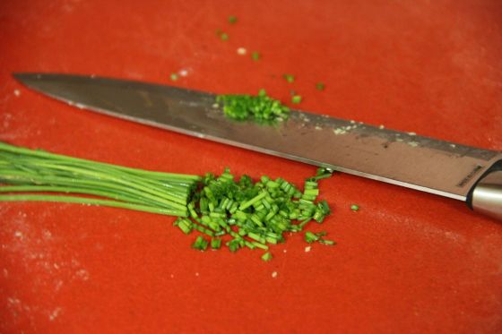 Cover and bring to a boil. Lower temperature to medium heat and simmer until the potatoes are tender when pierced with a fork, about 20 minutes. Chop the chives and dice the garlic while the potatoes are cooking.
