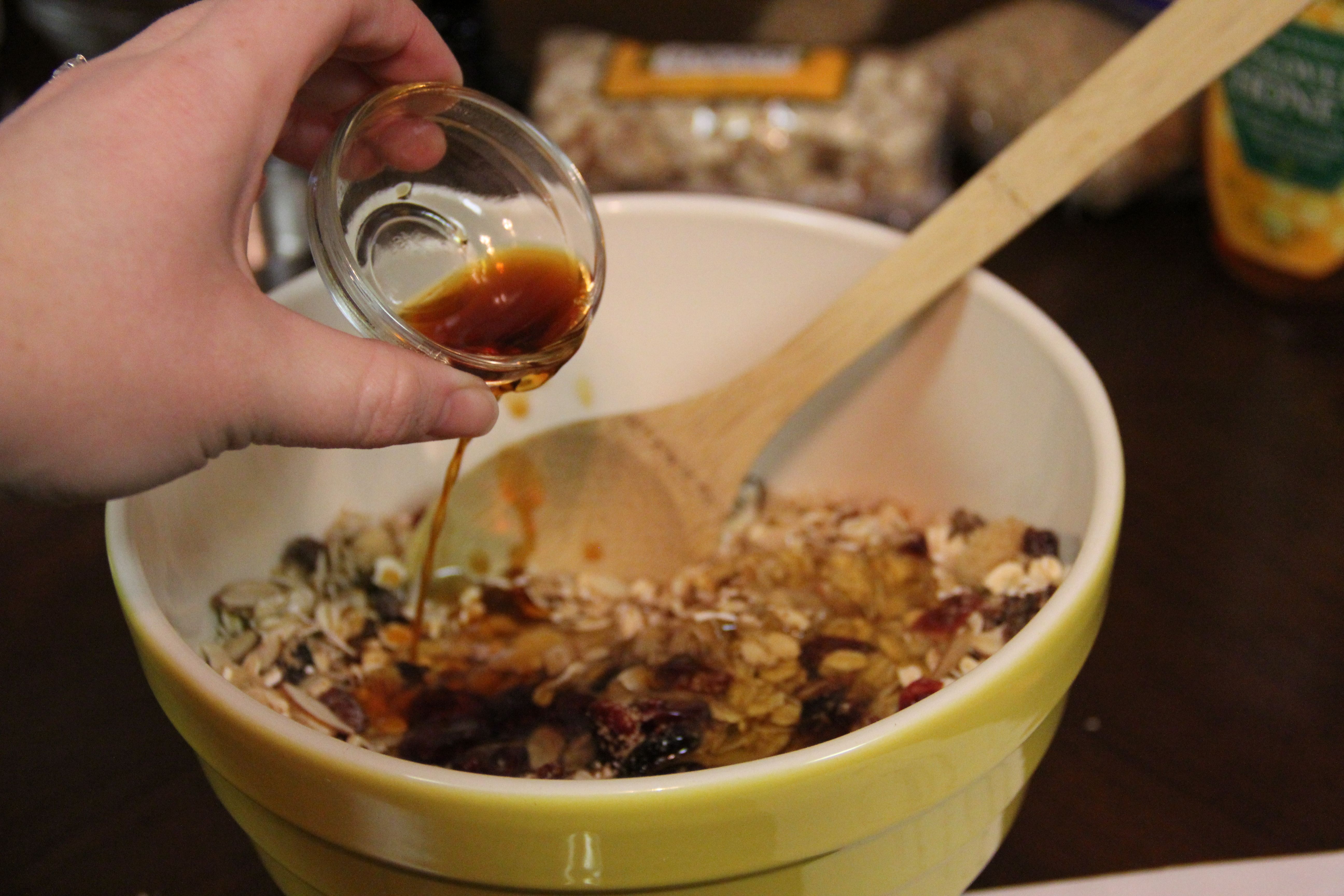 Place your oats into a large bowl and measure out whatever nuts you will be including. I used sliced almonds, sunflower seeds and ground flax seed, which is apparently some sort of nutritional powerhouse (check out that link, it’s crazy). The ground flax seed doesn’t really affect the taste very much but it adds a lot nutritionally. Sunflower seeds are a favorite of mine so I added a bunch the last time I made granola. They have a really strong taste and it kind of overpowered the rest of the ingredients, so I only used 1/4 cup this time and it was just right.