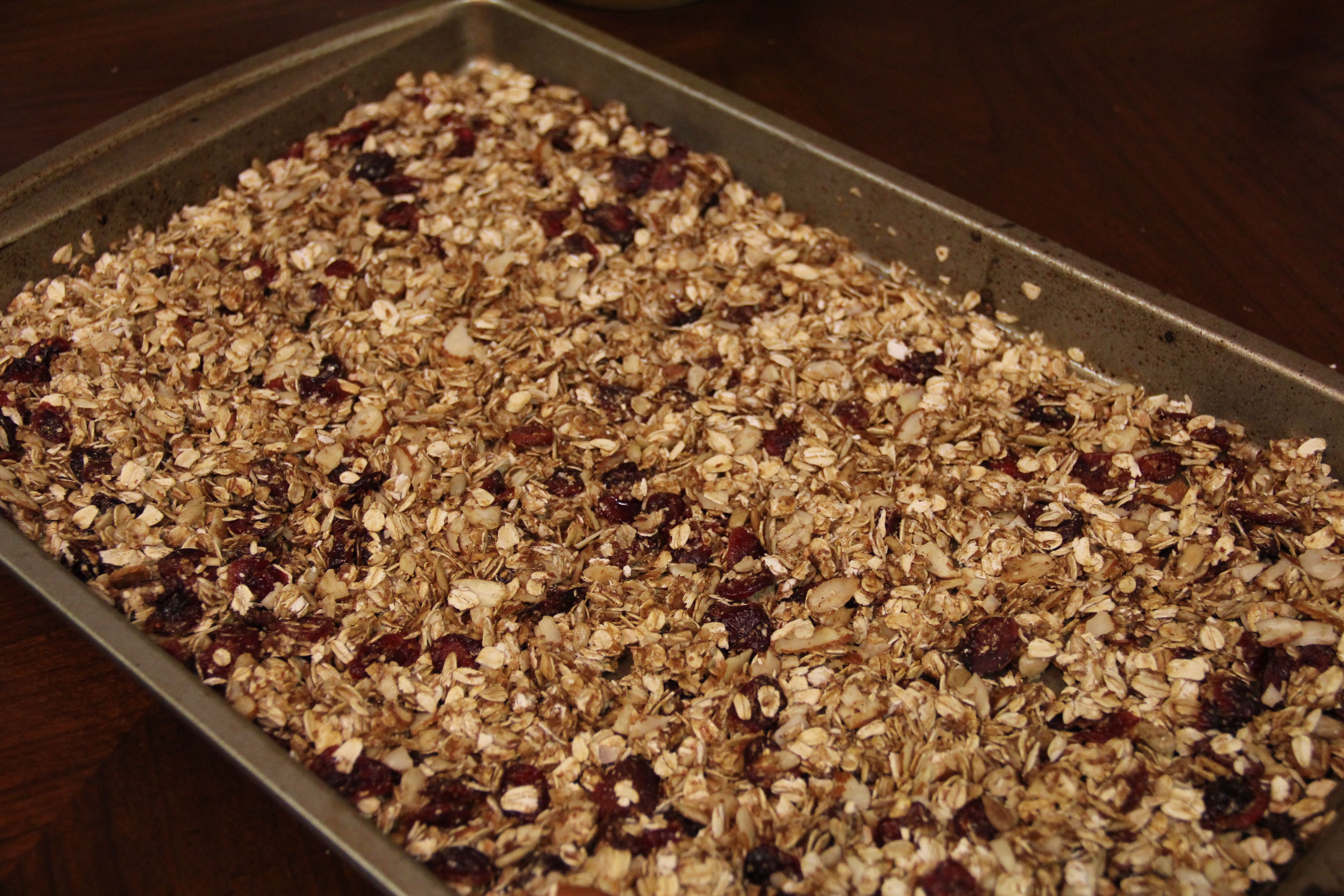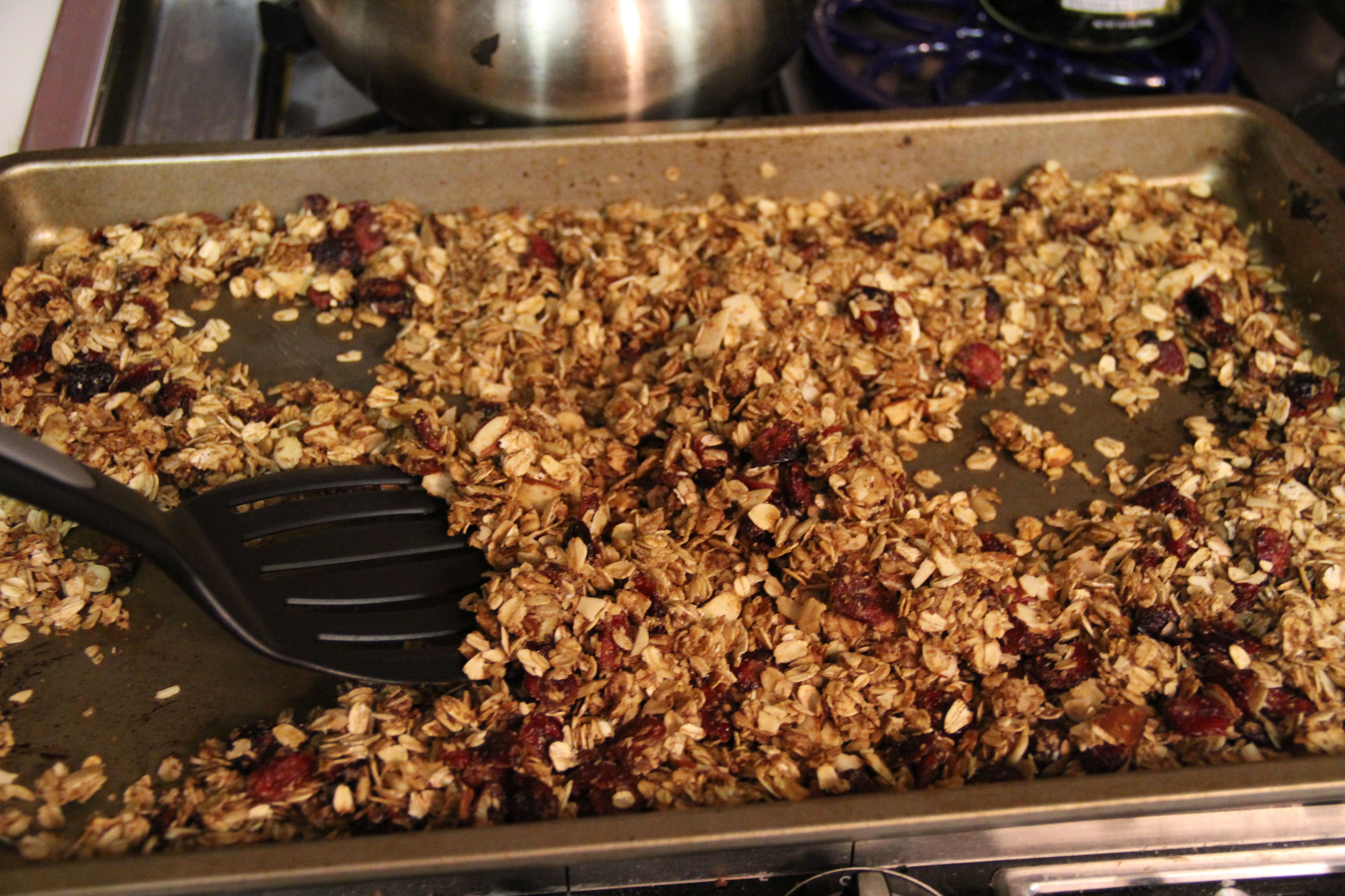 Remove the oats once they start to look lightly toasted. The granola will harden as it cools, so don’t assume that it needs more time in the oven just because it is still a little soft.