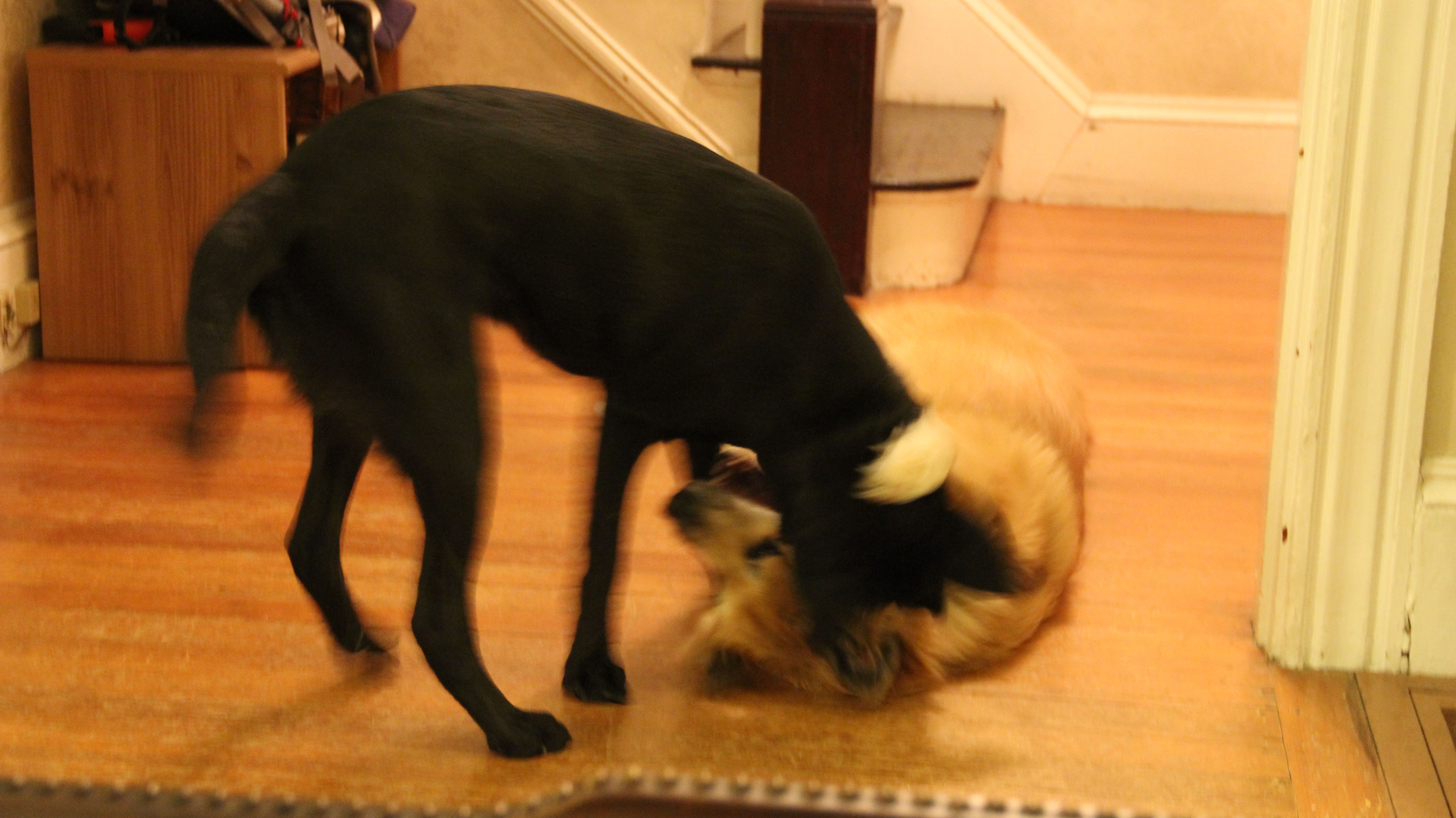 I think we’re really getting the hang of wrangling 2 dogs. We’re pretty good at walking them together and we hardly ever call them by the wrong name (not true). We’ve got feeding time down to a science, too: we put Maggie’s food down, then B’s food, and then they run to each others food bowl and huff it all down before the other one can get there. Luckily they’re eating the exact same amount of the exact same food so it’s not really an issue. They don’t know that, though.