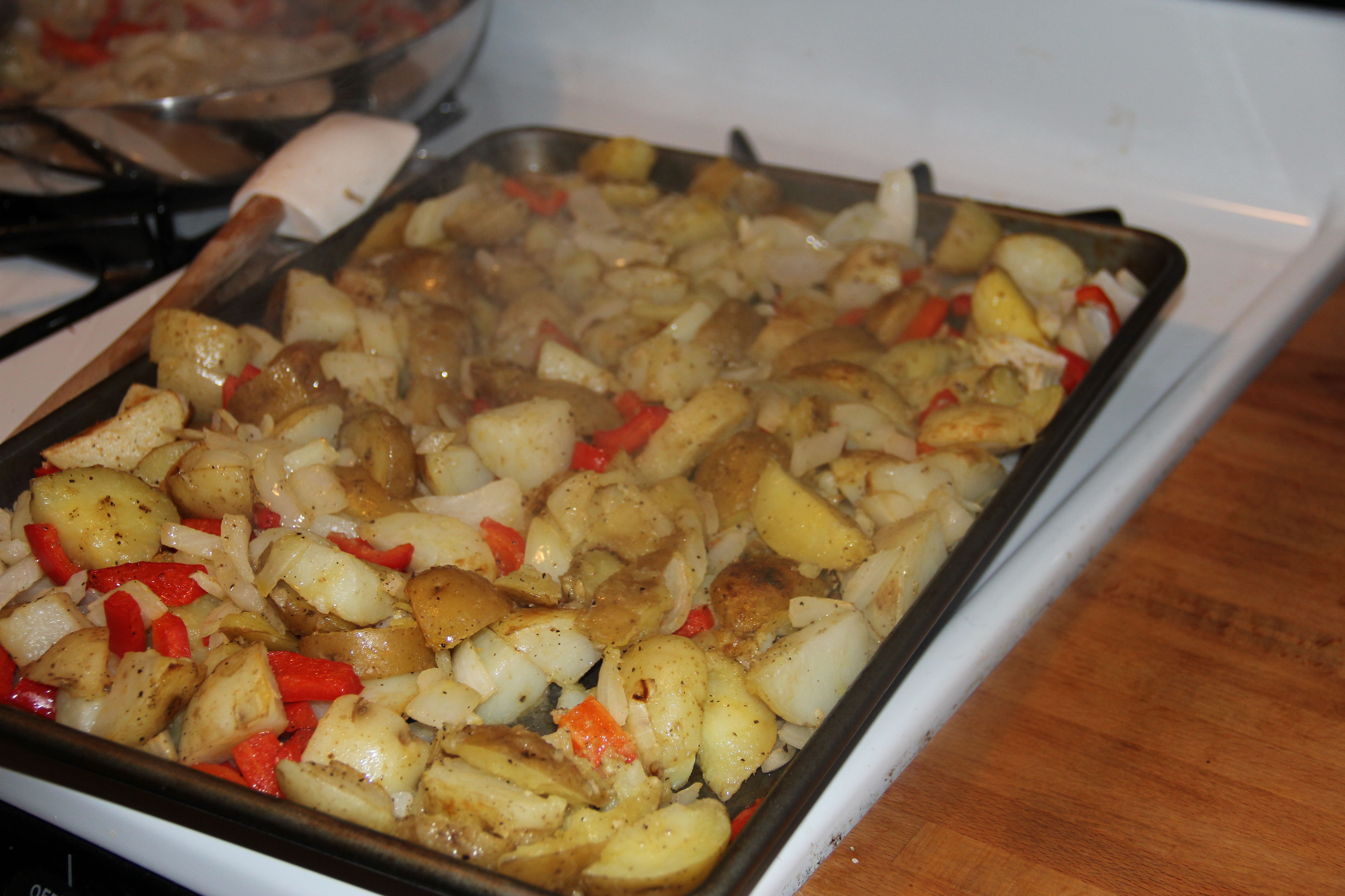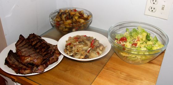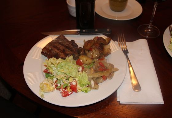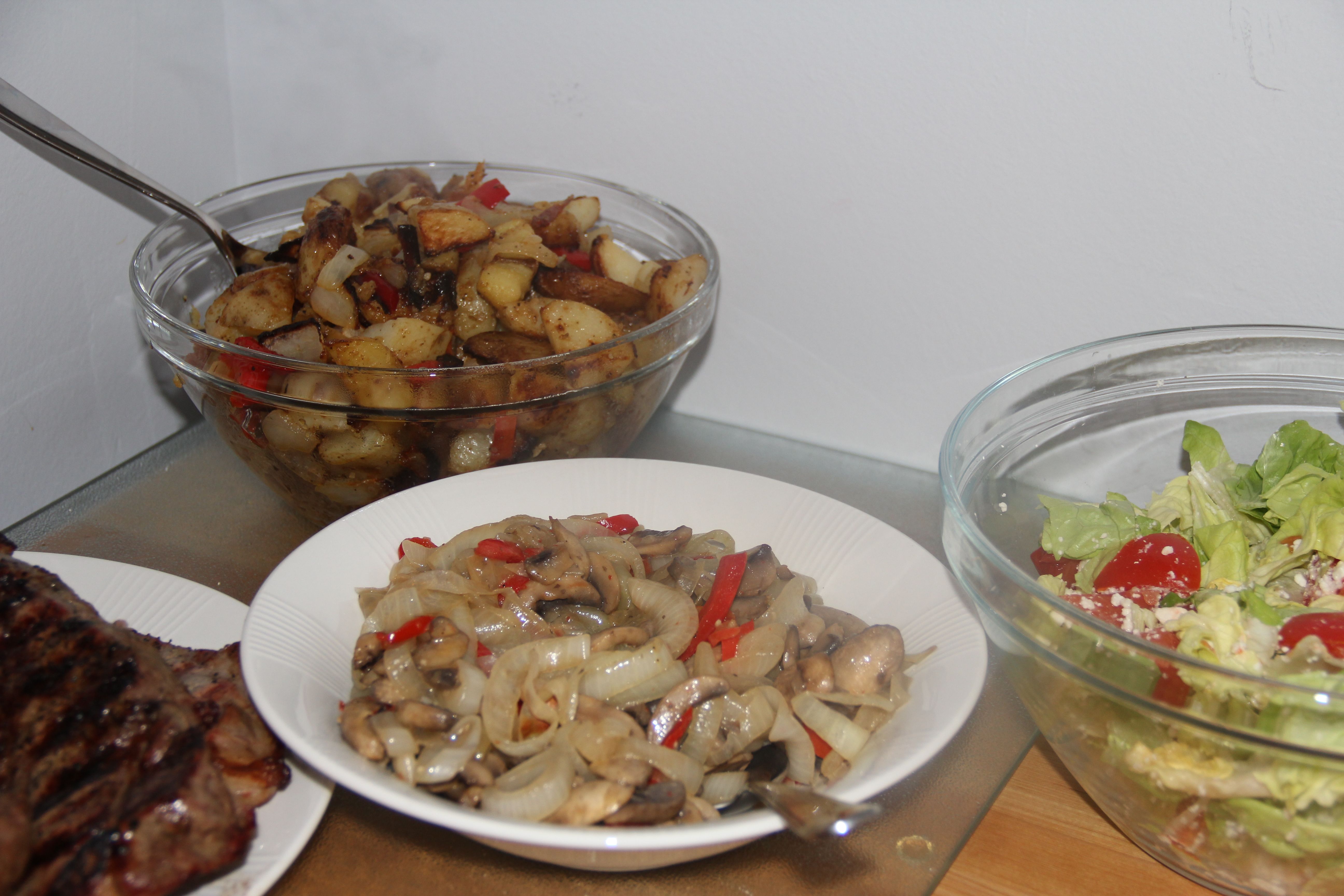 On the menu: Sauteed peppers, mushrooms and onions, roasted potatoes with prosciutto, salad with tomato and feta and big ol’ steaks.