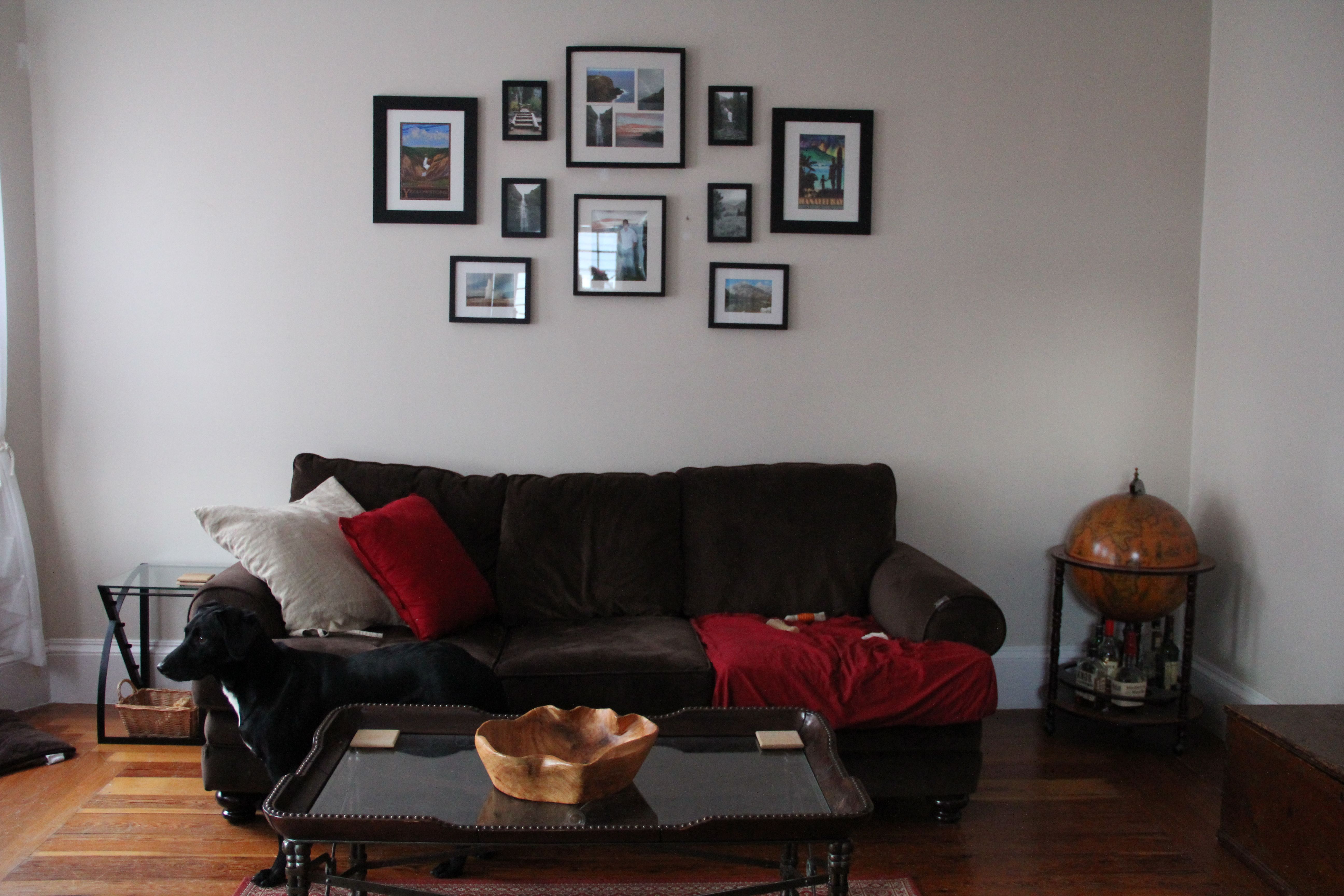 - I finally (finally) put some pictures on the wall in the living room. For a long time the long wall in that room was occupied by 2 unevenly-hung frames housed on nails that were already in the wall when we moved in. No more!