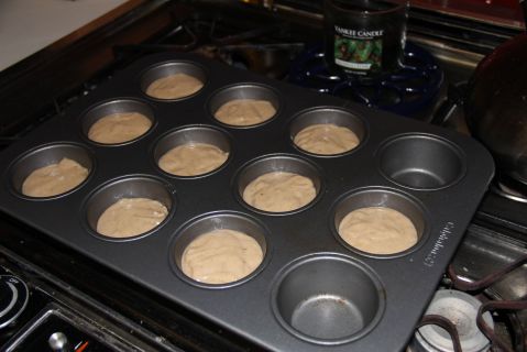 Add the dry ingredients to the wet ingredients and stir just to combine. Spray a muffin pan with non-stick cooking spray (or use cupcake liners) and fill each about 2/3 of the way (about 1/4 cup of batter).