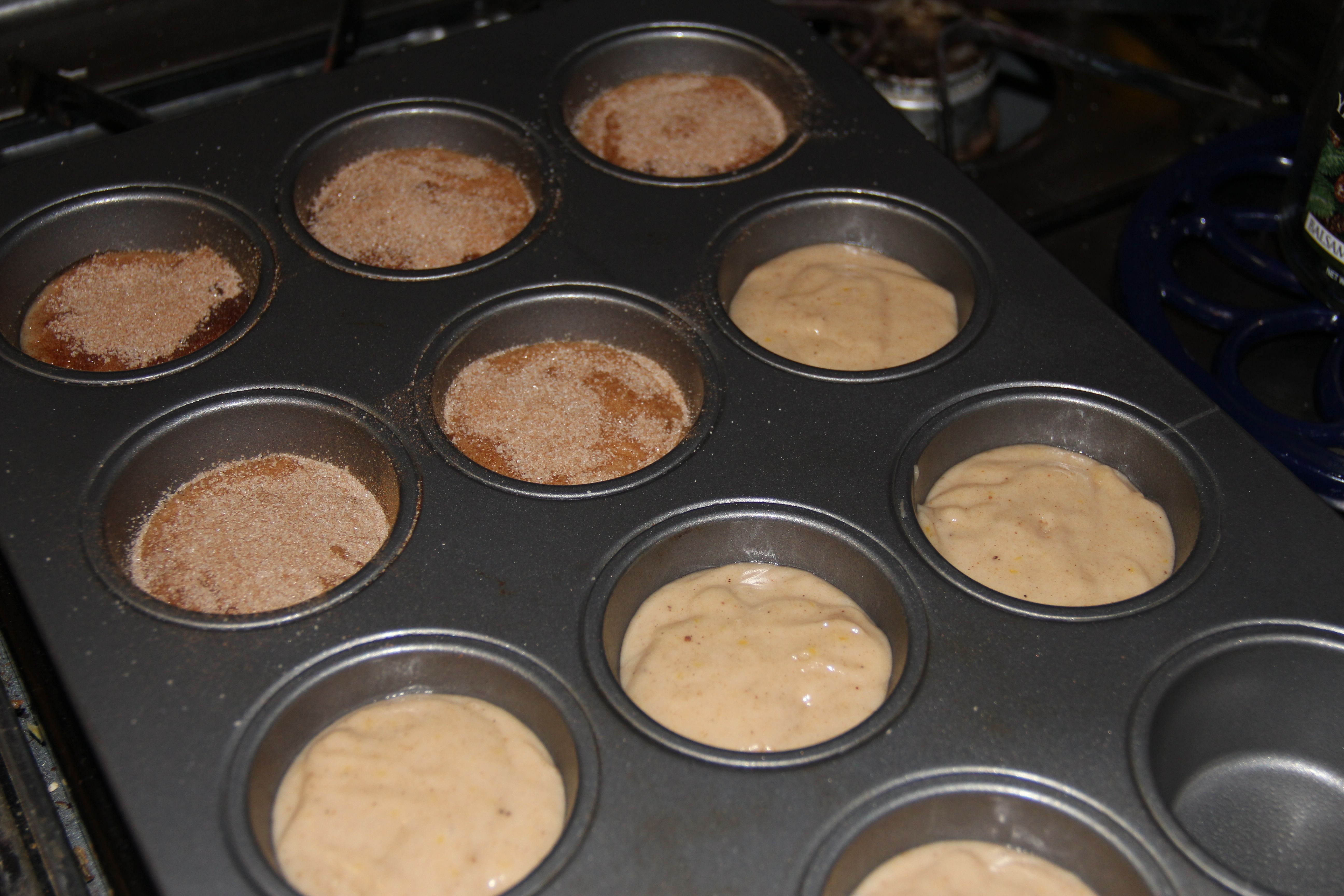 Now I went rogue here a little and decided to try something different. I wanted to see if you could just sprinkle the batter with cinnamon and sugar and then bake them and have a similar outcome as baking them plain and then coating them in melted butter/cinnamon and sugar as instructed in the original recipe. I decided to try my method on half and the butter method on the other half and see which came out better.