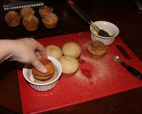 From here (if you’re going the butter route), melt the butter and mix the cinnamon and sugar and remove the muffins from the pan while they’re still hot. Brush the top of the muffin with melted butter (or just dunk it right in there)