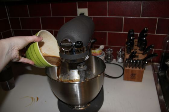 Beat the butter, brown sugar and white sugar for a few minutes on medium speed.
