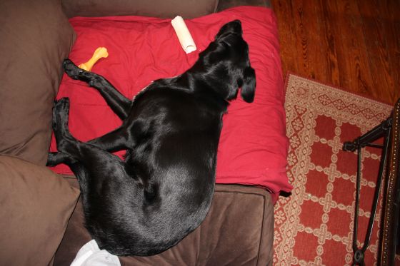 When we first adopted Brody, we brought him over to my parents house to show him off. He did us proud by peeing on the carpet a few times, eating a phone book and running around the house with part of a potted plant. It took a few months before Brody ever sat down, let alone laid down, while at my parents house. When the day finally came when we looked over and B was sleeping quietly in the living room, my mother and I immediately went over to him and started petting him and telling him how cute he was. My dad was flabbergasted and said “What are you doing?! He JUST went to sleep, leave him alone! Let sleeping dogs lie!” My mom and I sheepishly stepped away from the hound, but at that point he was already up and tearing around the house again.