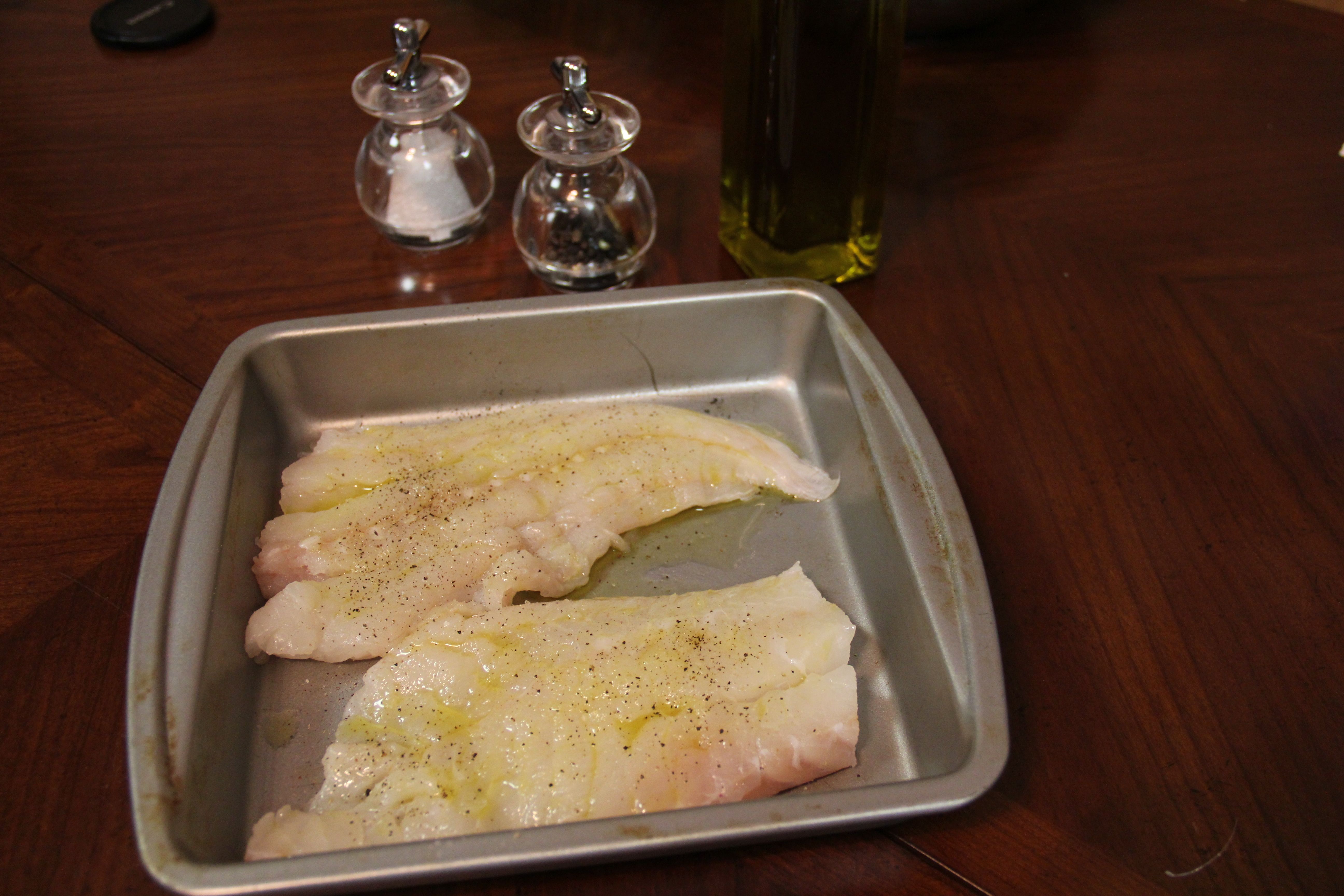Place the fish skin-side down in a pan or on a baking sheet. I would normally recommend lining the pan with tinfoil but we didn’t have any so I just sprayed the bottom with a nonstick spray. Rub the fish with olive oil and season with salt and pepper.
