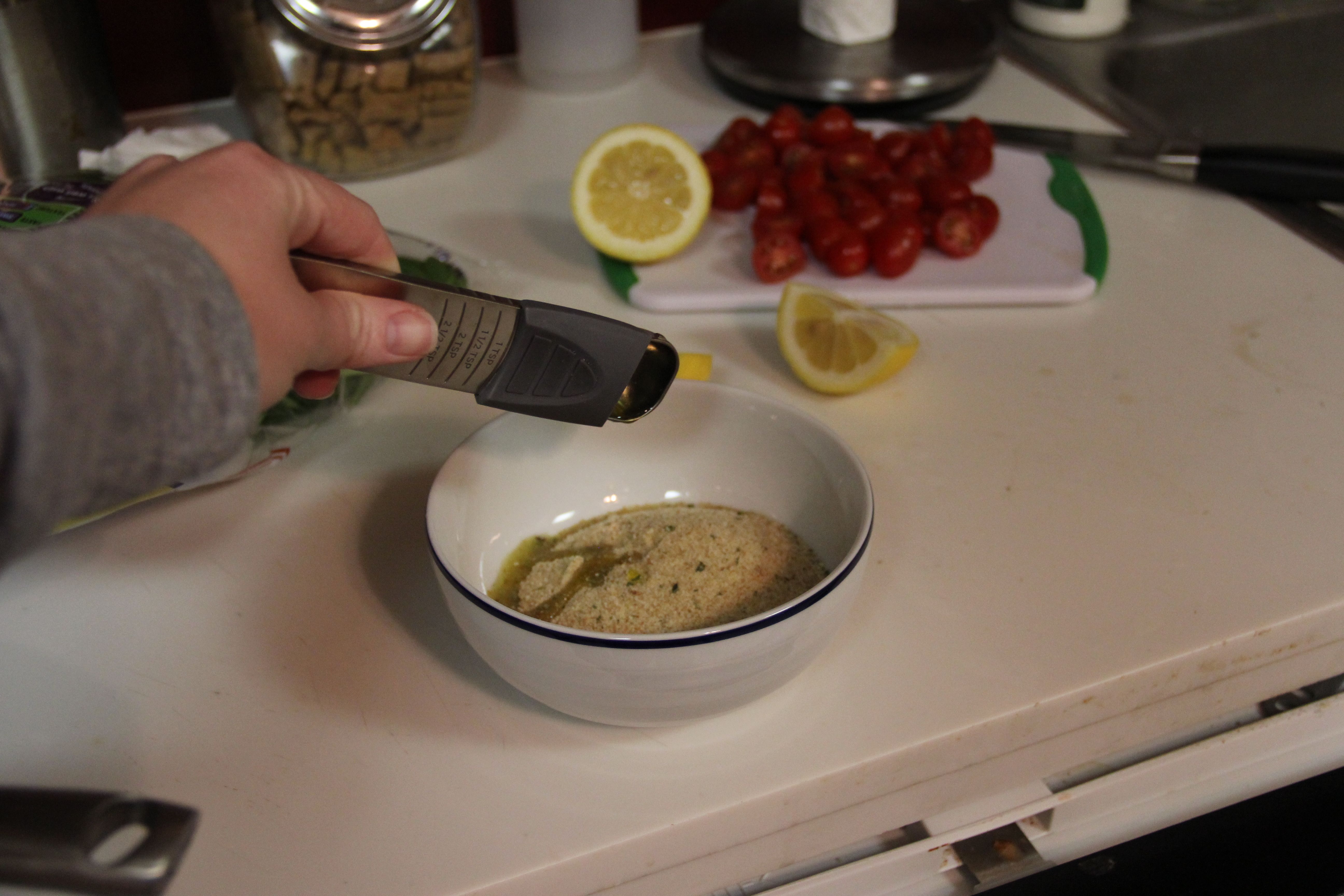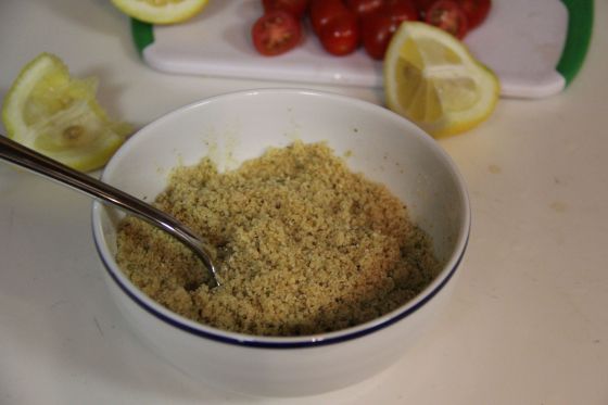 Melt the butter and combine in a small bowl with the breadcrumbs, olive oil and lemon juice.