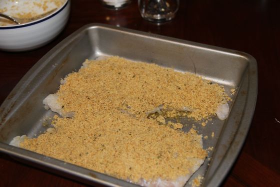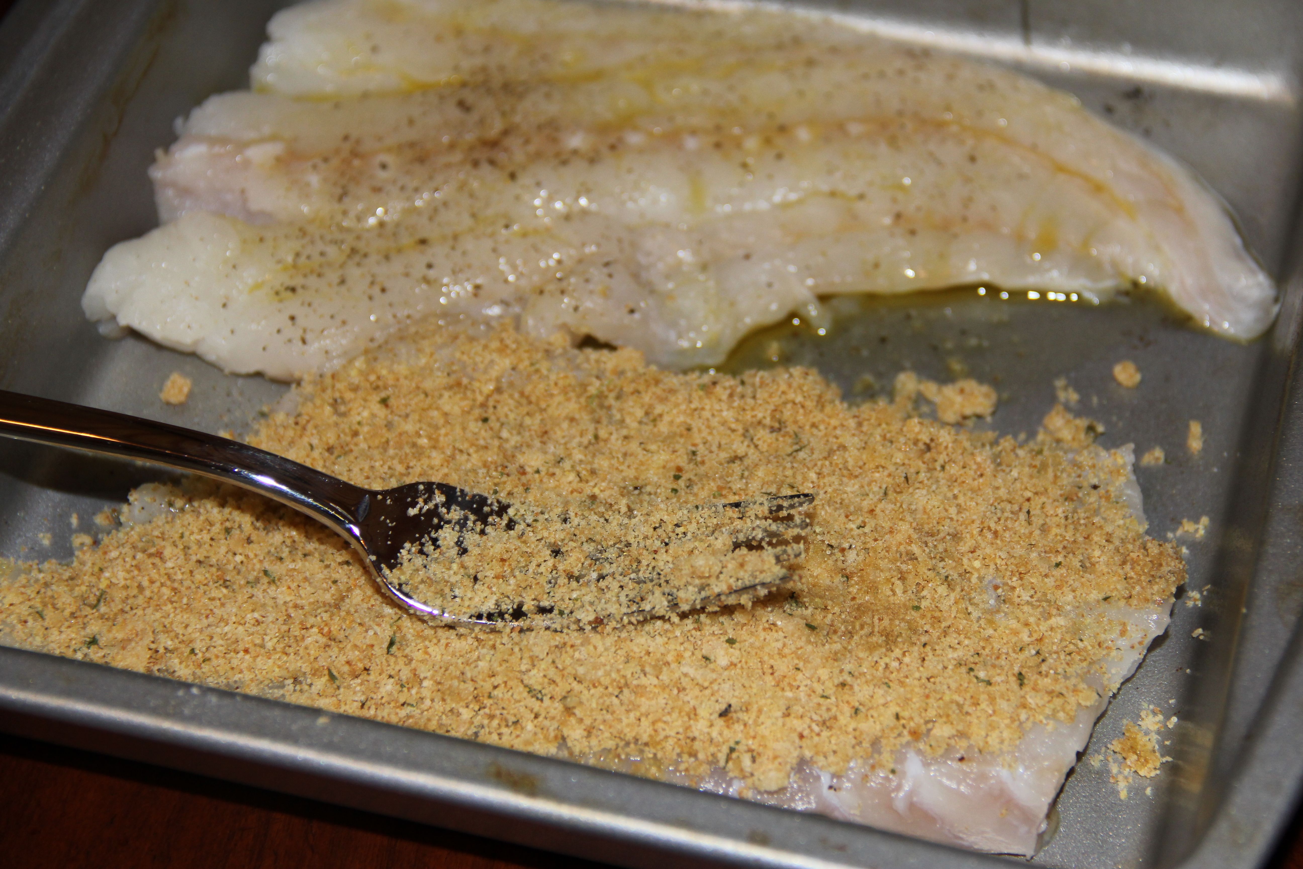Spread the bread crumb mixture onto the fish and press down with a fork.