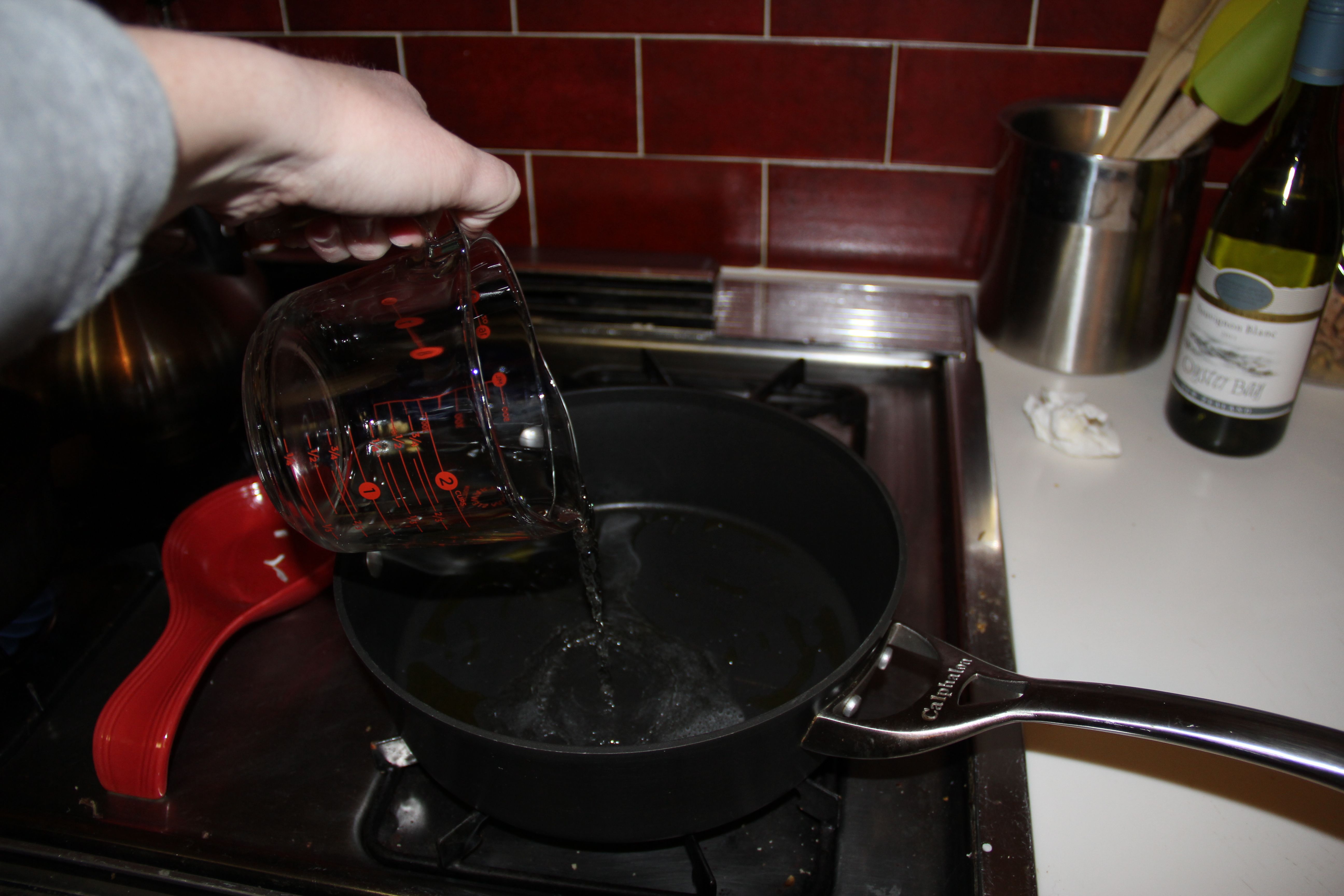 Heat up some olive oil in a large skillet and then add the wine, salt and pepper.