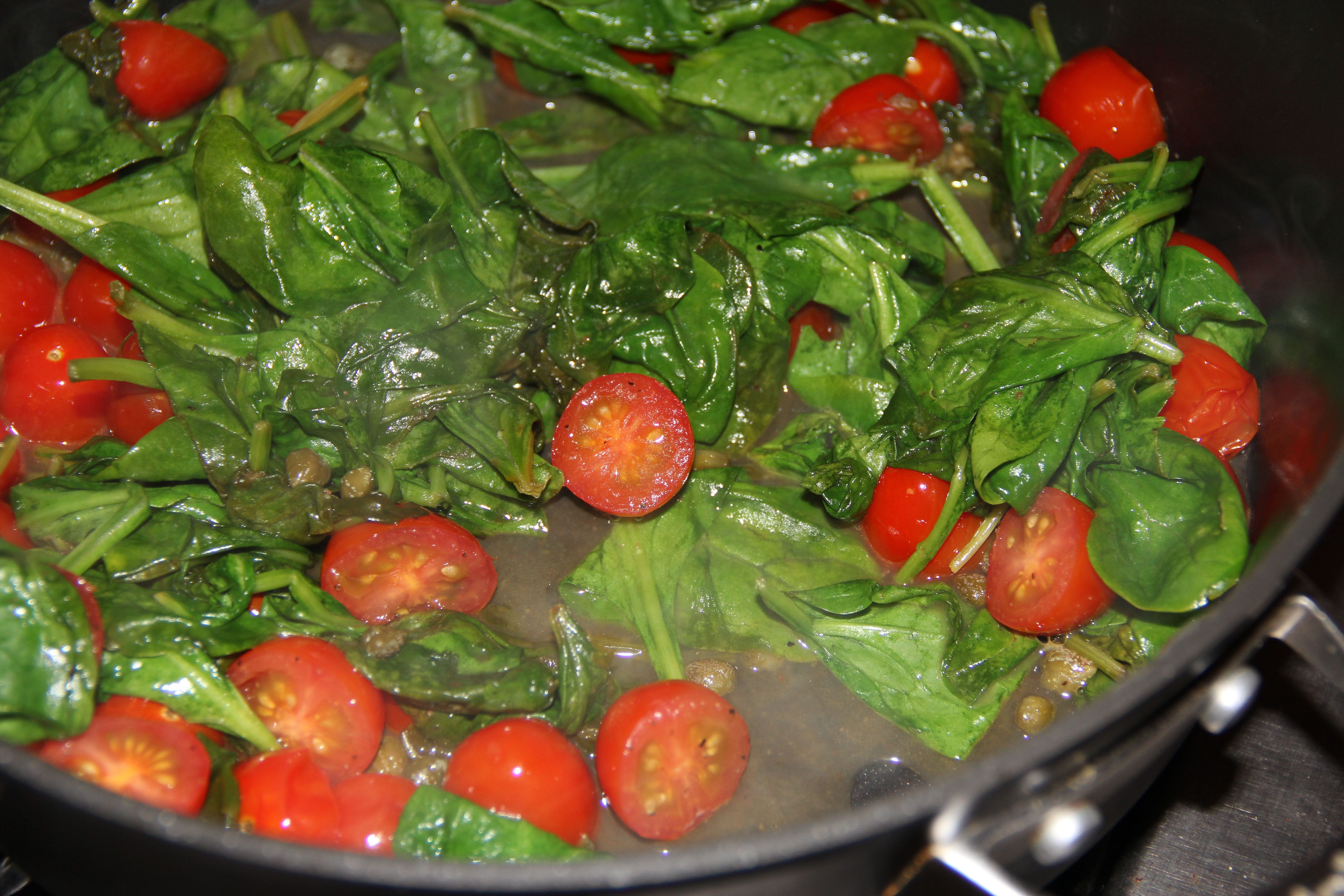 Heat 1 tablespoon of olive oil in a skillet over medium heat. Add the lemon juice, white wine, salt and pepper. Bring the liquid to a boil, lower it back to medium and saute until your liquid reduces by half. Add the tomatoes, capers and spinach and saute until your spinach is just wilted, about 1 minute. Serve the fish over the spinach and tomatoes.