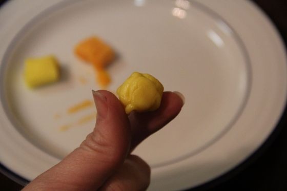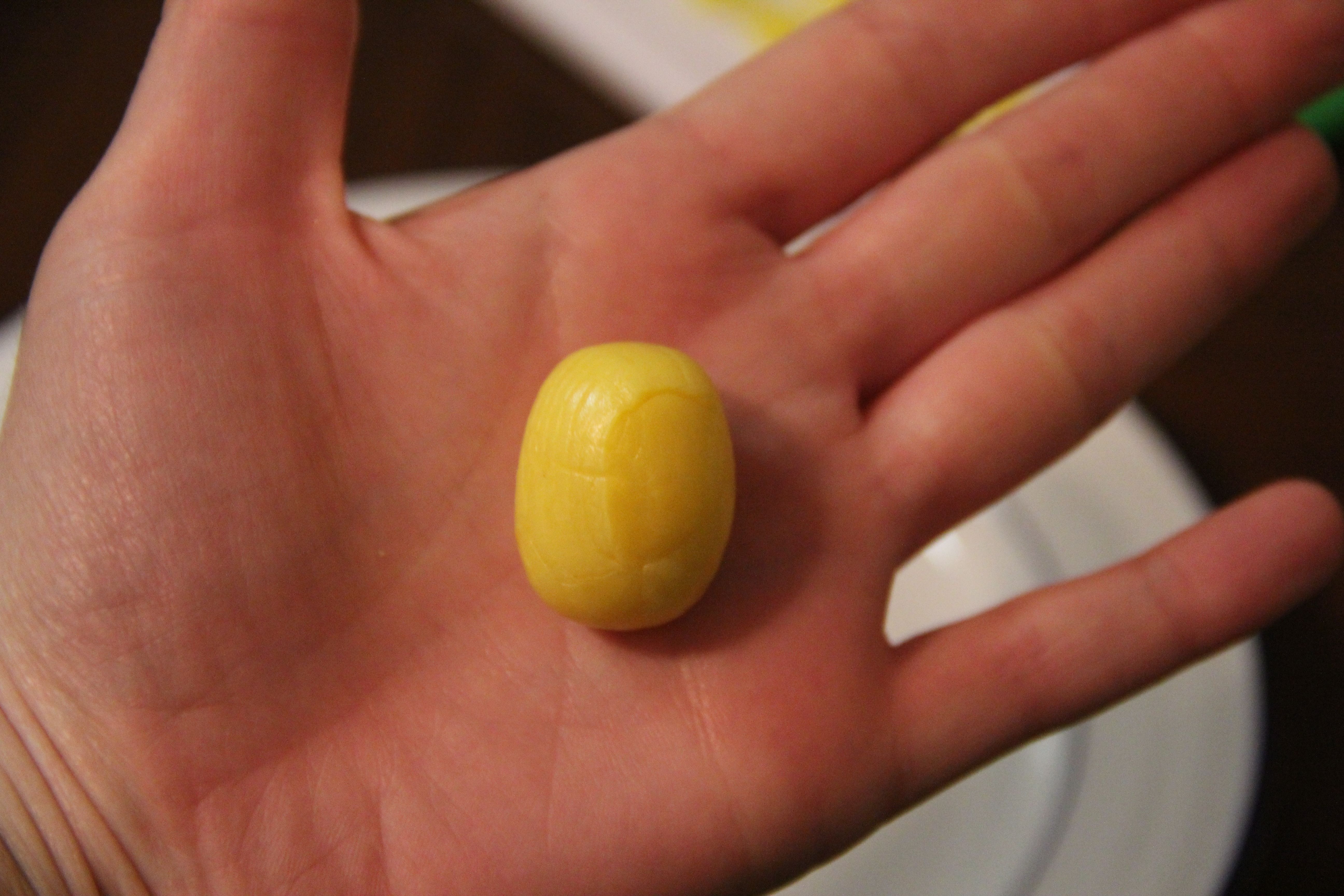 Once the candies are soft but not a burn risk, grab one of the yellow ones and knead it a little to lose the original shape.