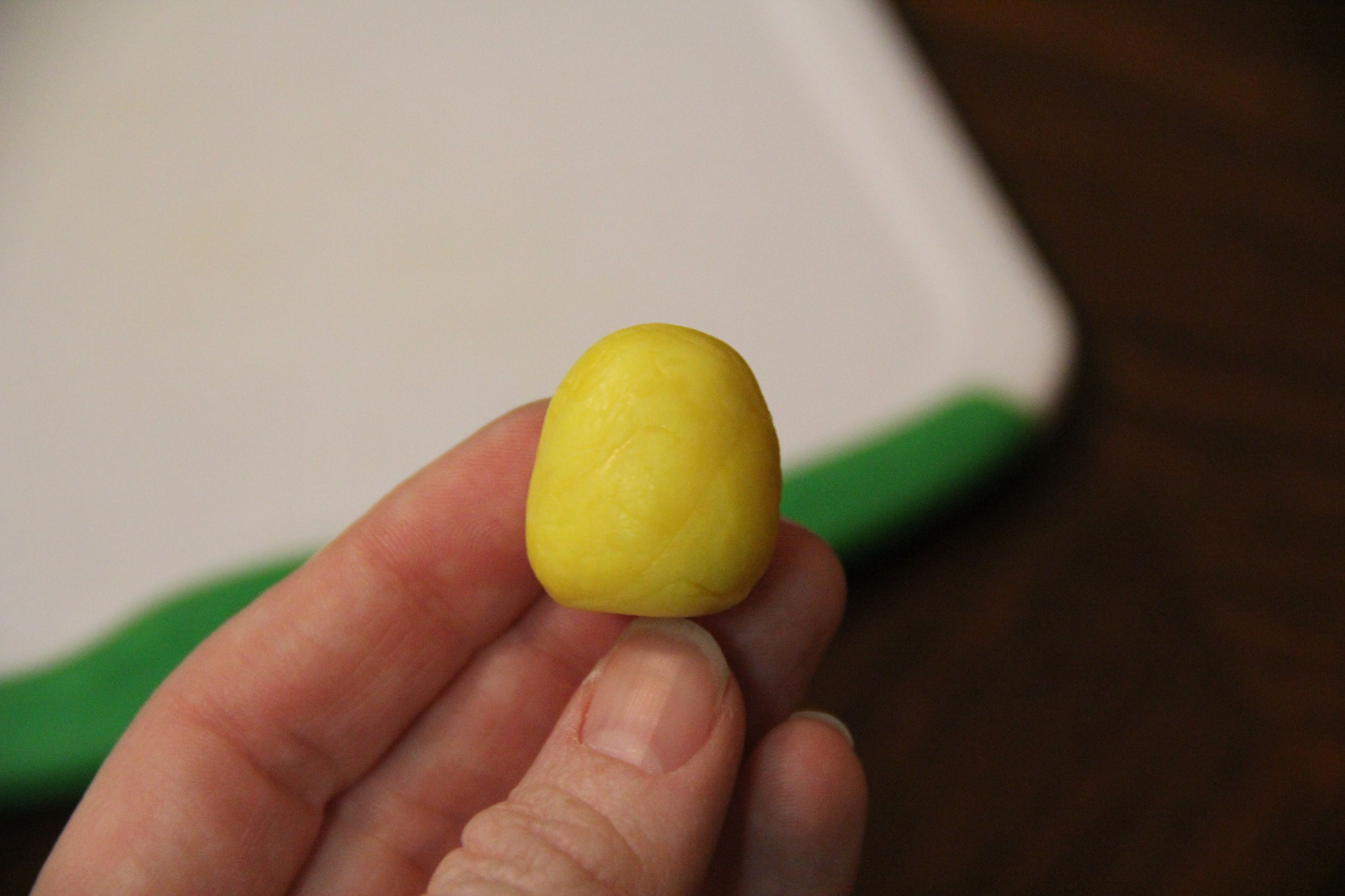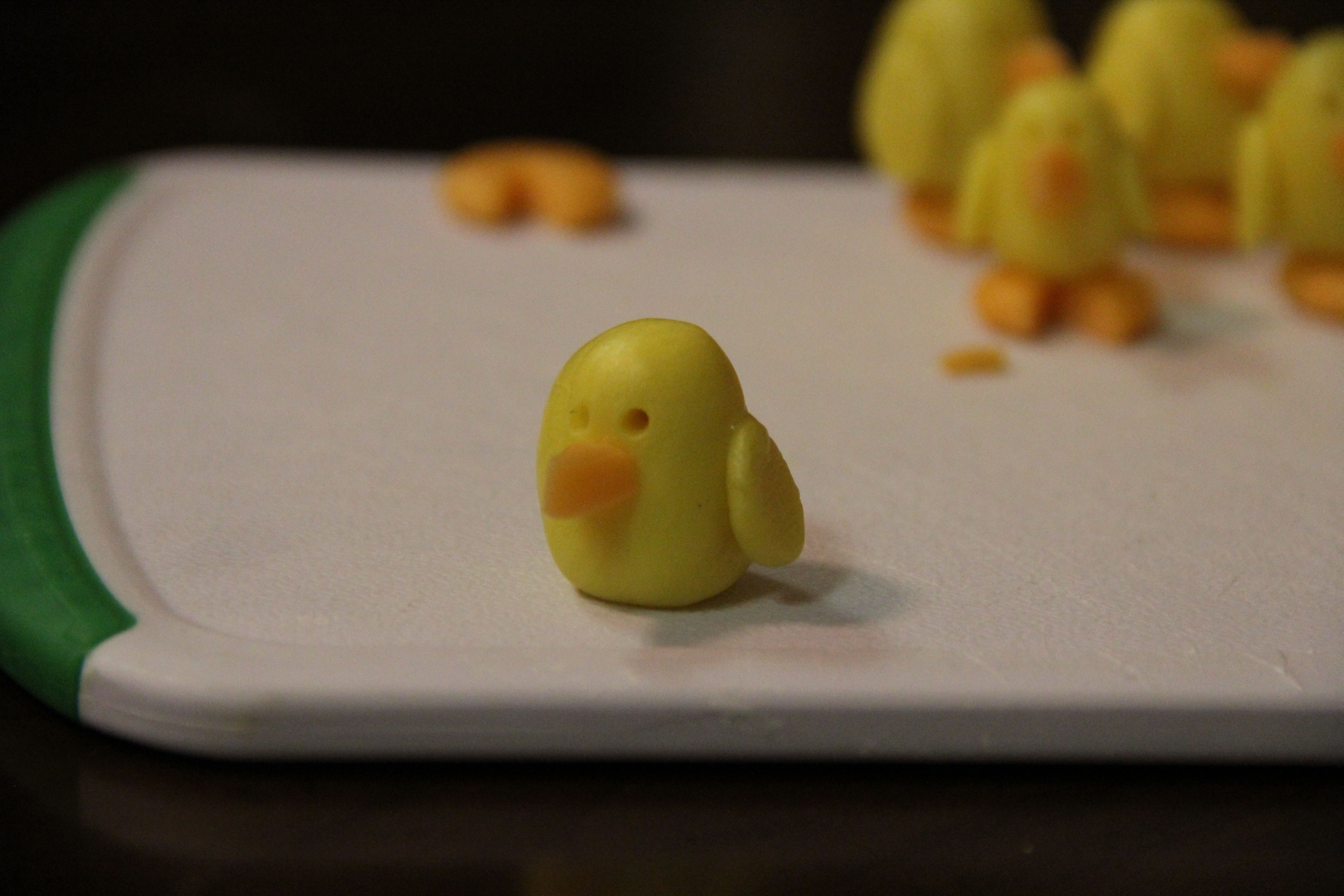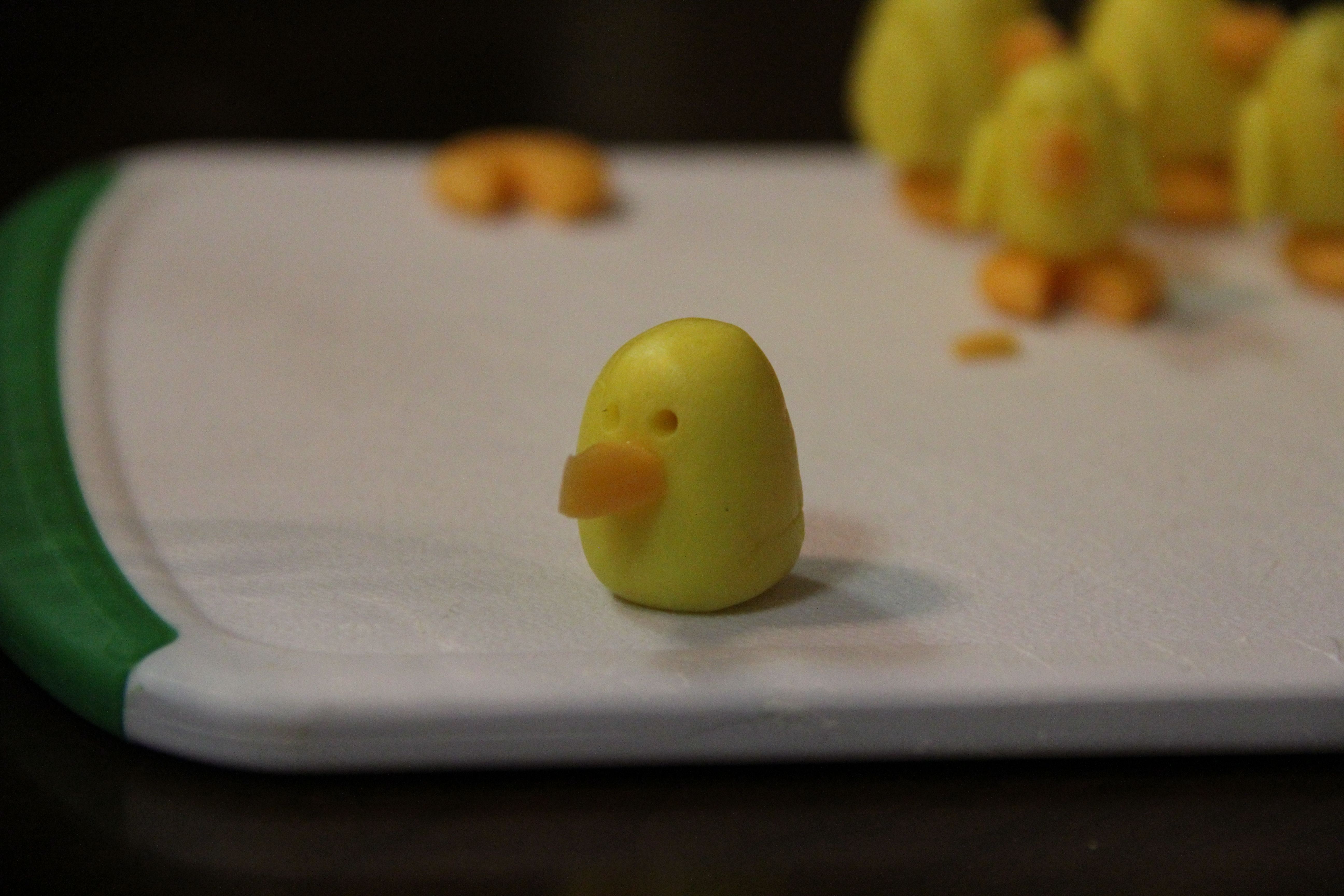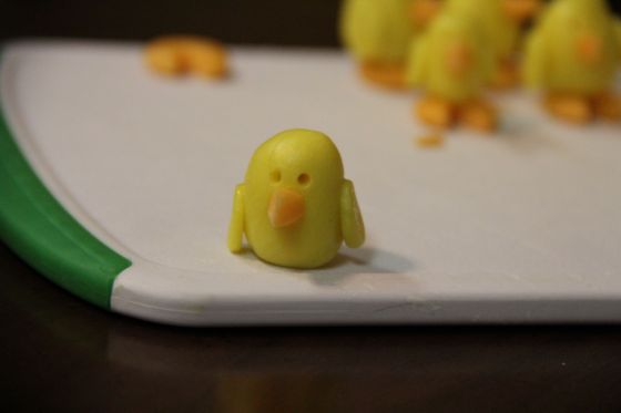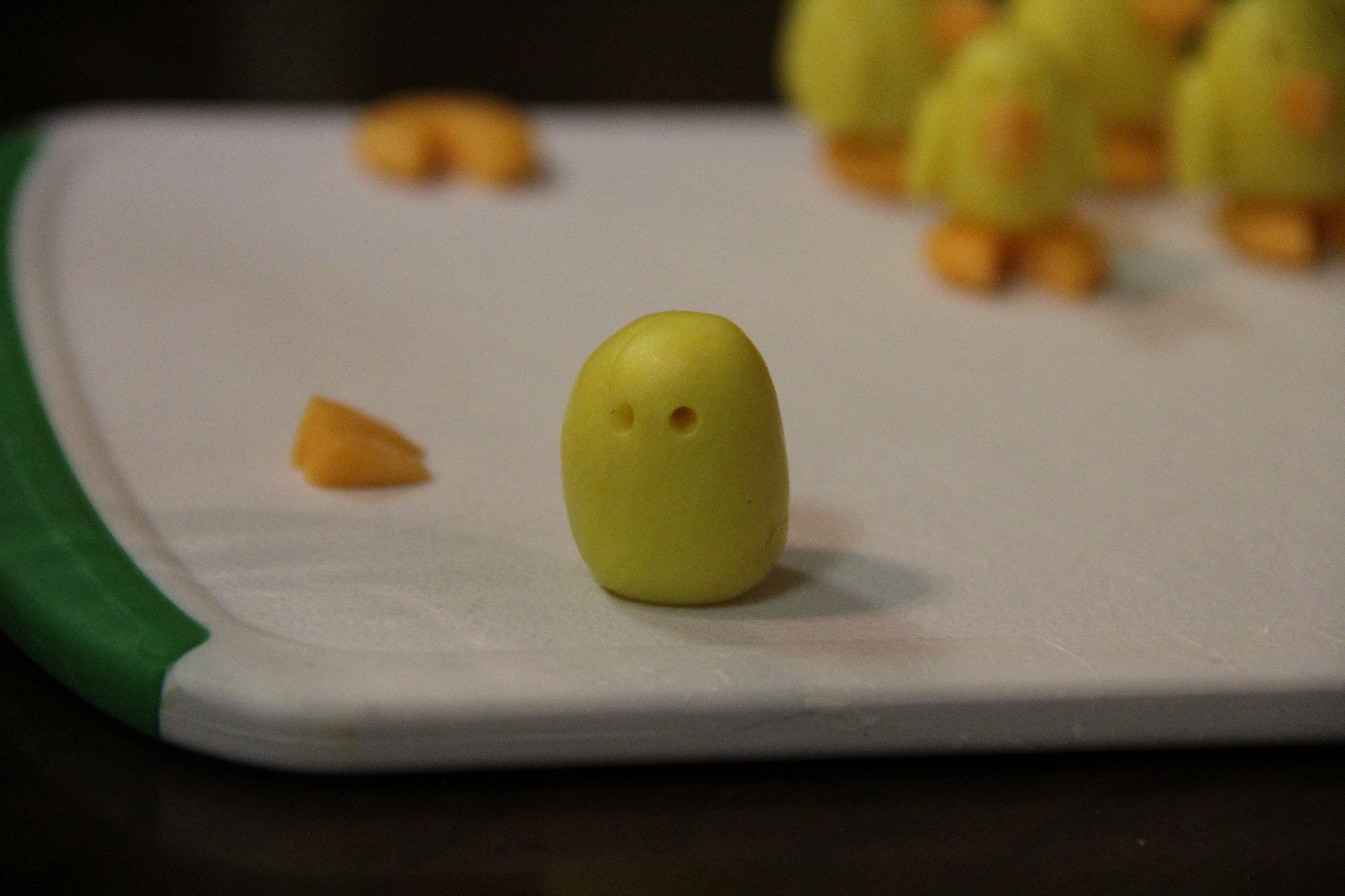 Don’t eat that little piece though, that’s the beak! Cut a little off of the rounded end so that it will be a better fit against the body of the chick. You can eat that little piece.