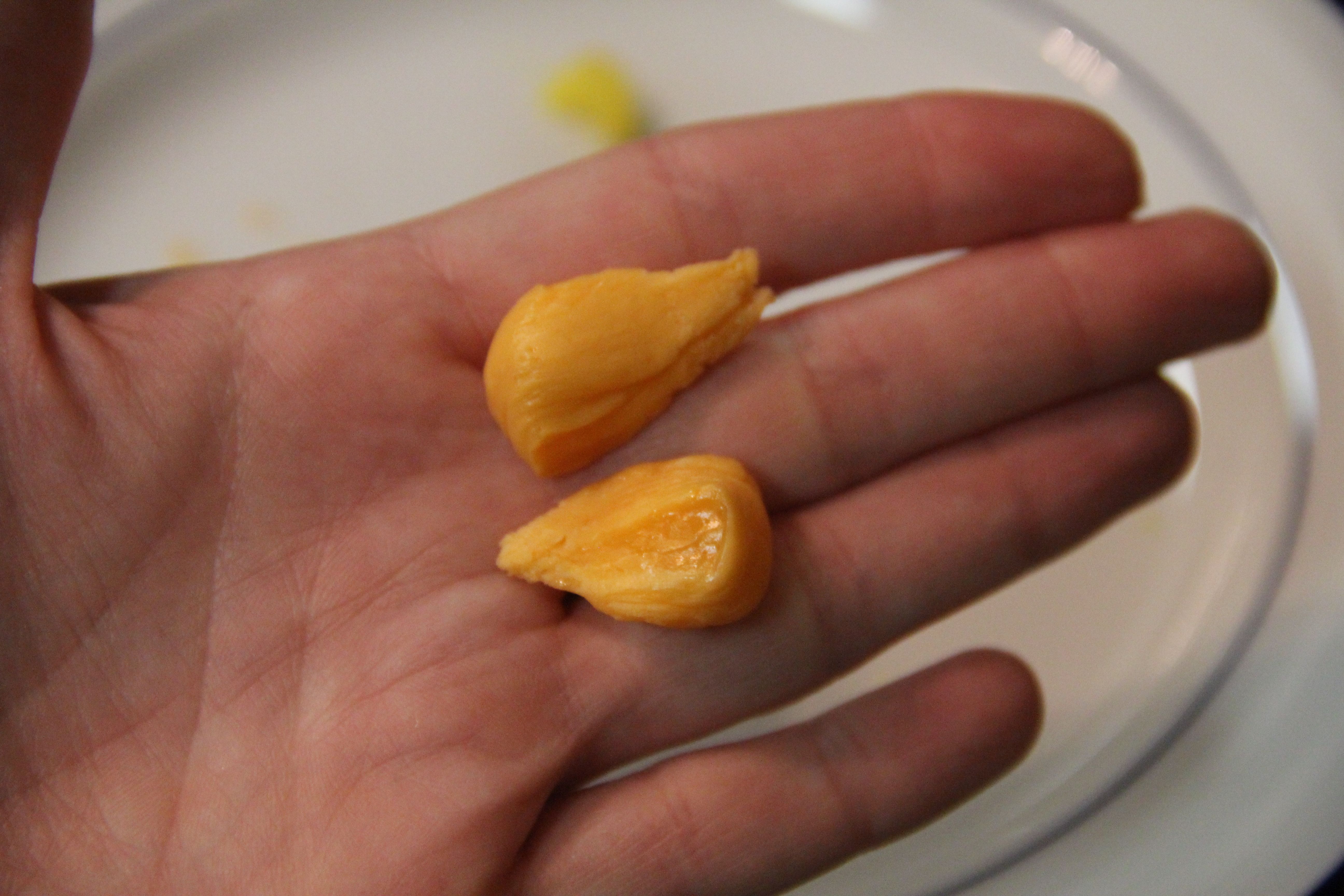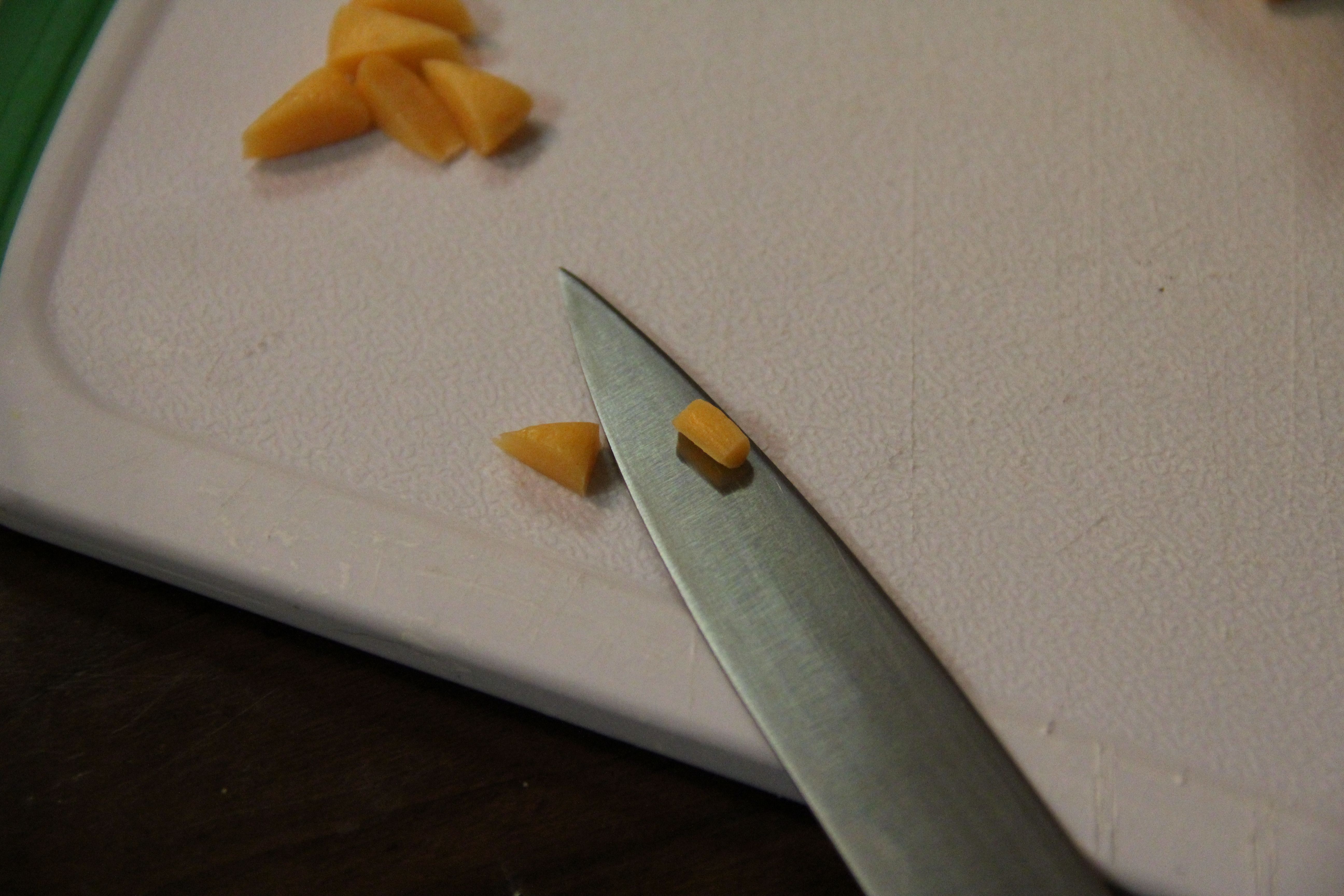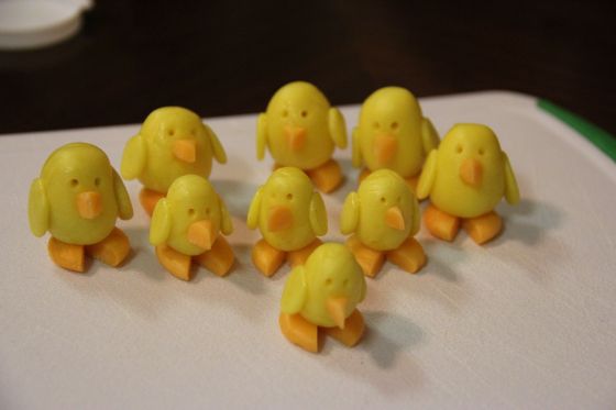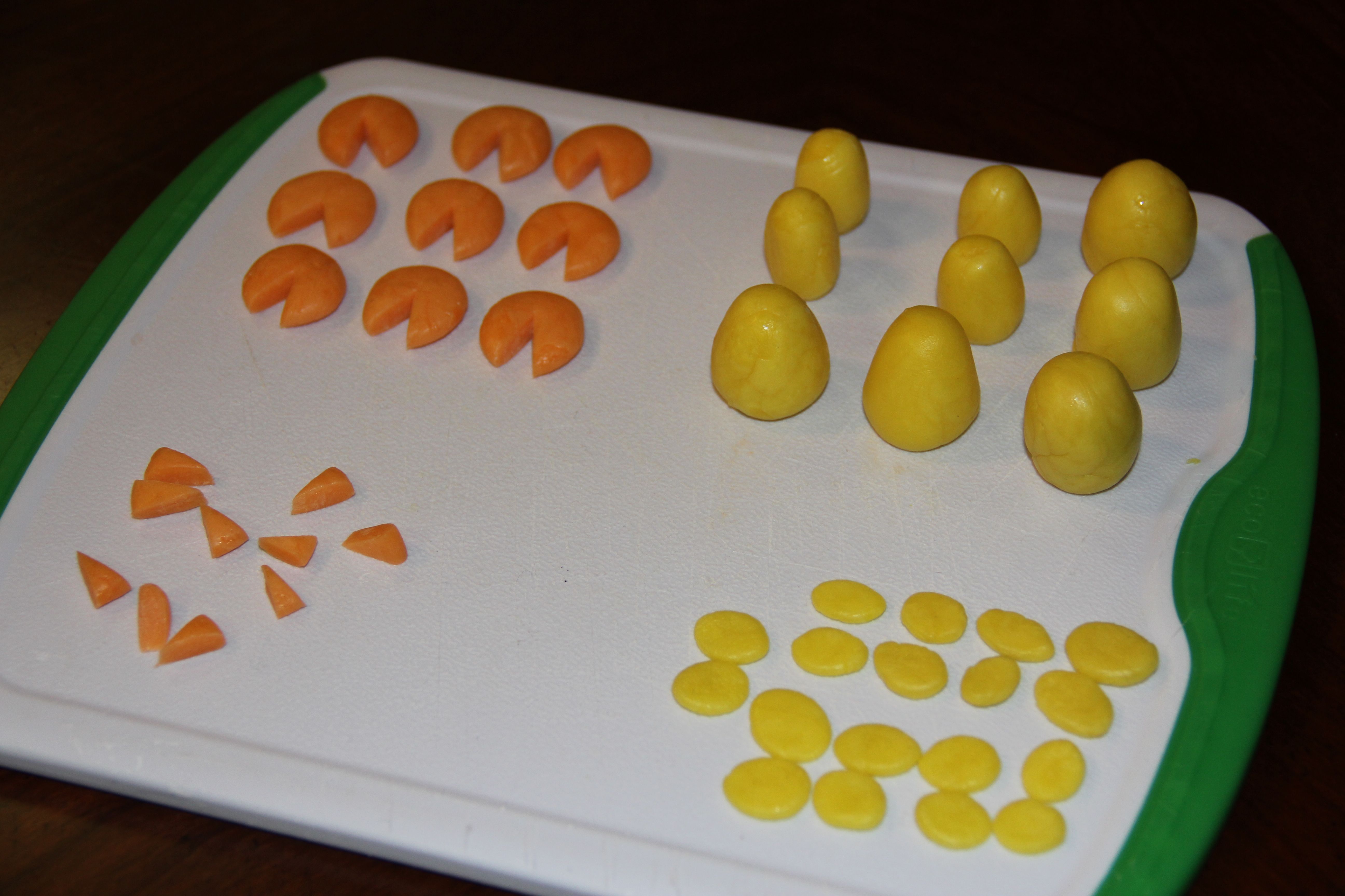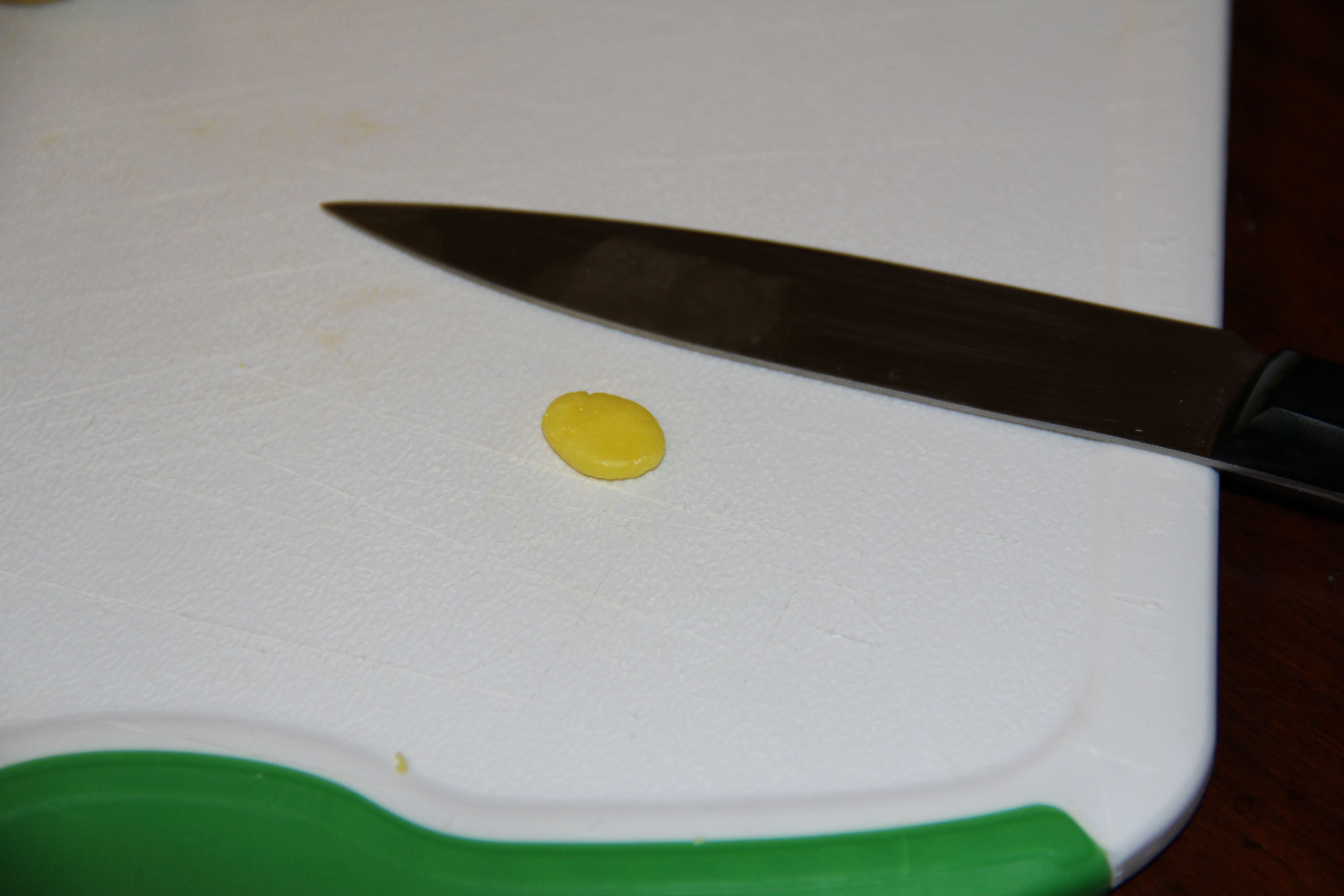 Don’t eat that little piece though, that’s the beak! Cut a little off of the rounded end so that it will be a better fit against the body of the chick. You can eat that little piece.