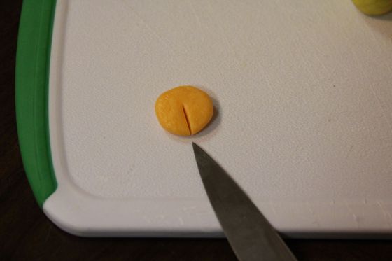 By now the orange discs should have hardened, so its time to make the feet. Using a sharp knife, make a cut to the center of the disc
