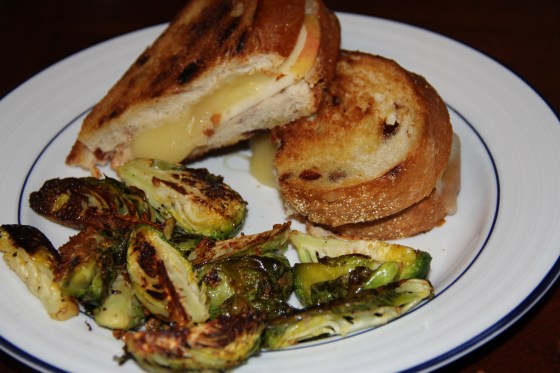 Grilled cheddar cheese and apple sandwiches on cranberry-apple bread and Parmesan roasted Brussels sprouts. Do yourselves a favor and make this meal. It’s really good. I know, I know – Brussels sprouts are gross and no one even likes them. Not these ones. Just do it.