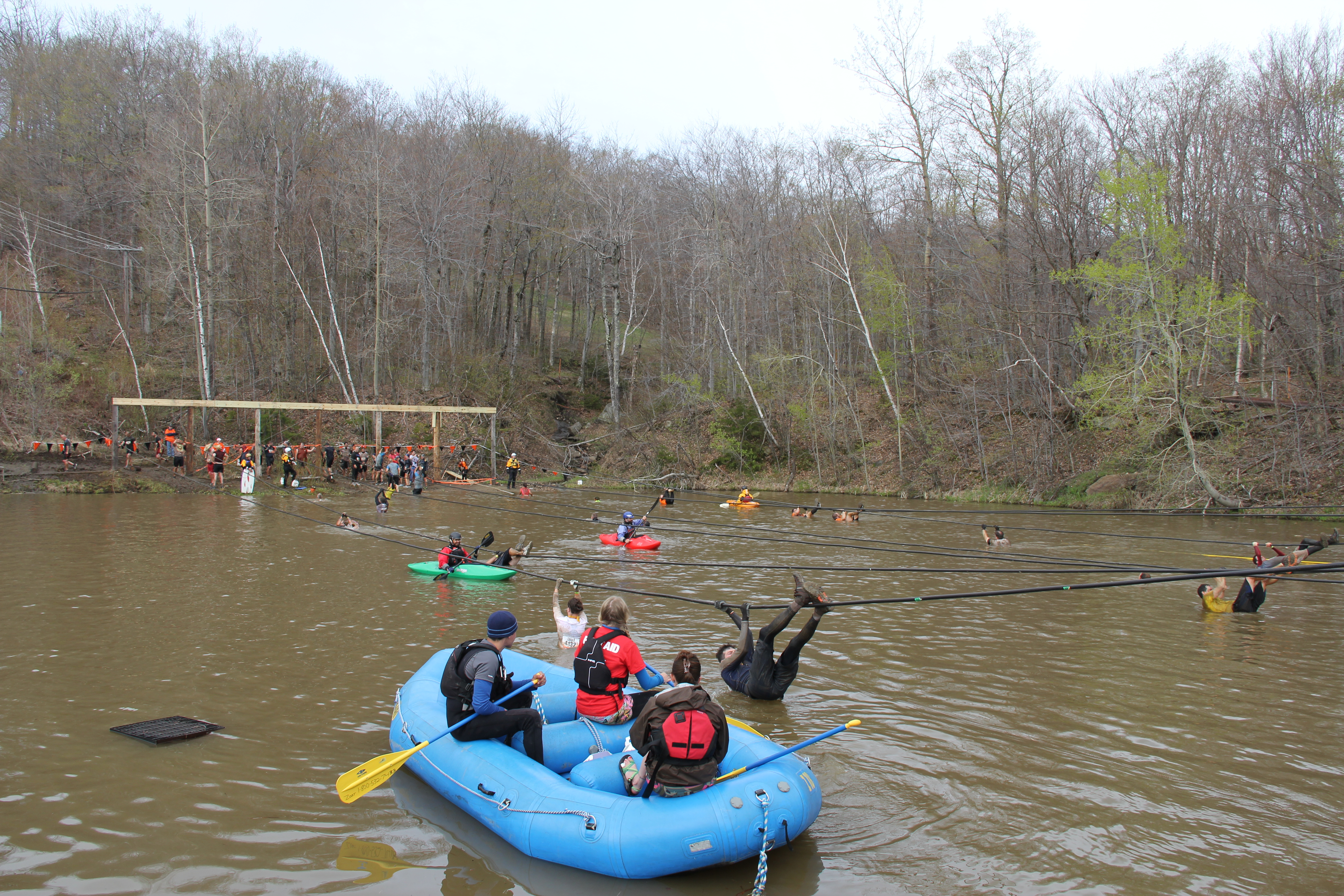 Ropes over the water (I don’t remember the name of this obstacle) – shimmy along a rope to cross a freezing pond. If you fall in, start swimmin’. This one wasn’t bad. All you had to do is just keep pulling with your arms and your legs will slide along. People were trying to use their legs too much and that was slowing them down. Once you hit the water, drop your legs and float while you pull with your arms until you hit a point where you can just walk to the end. One of the kayak guys fell off his kayak, so that was pretty funny. He wasn’t even rescuing anyone, just floating.