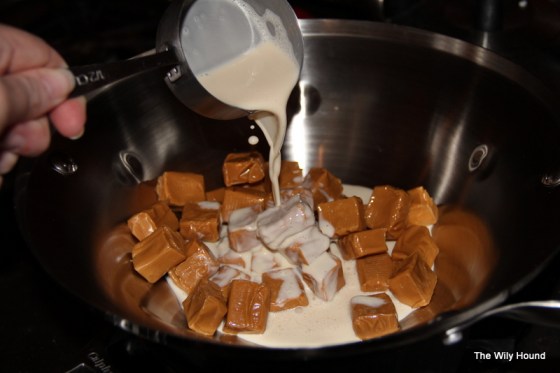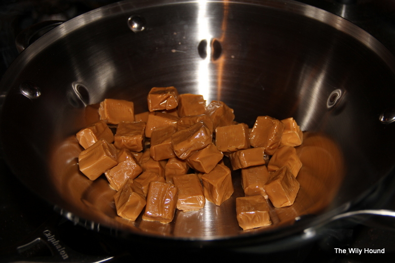 While that is baking, start unwrapping your caramels and toss them in a double broiler. This is a thankless task, so reward yourself with the occasional caramel.