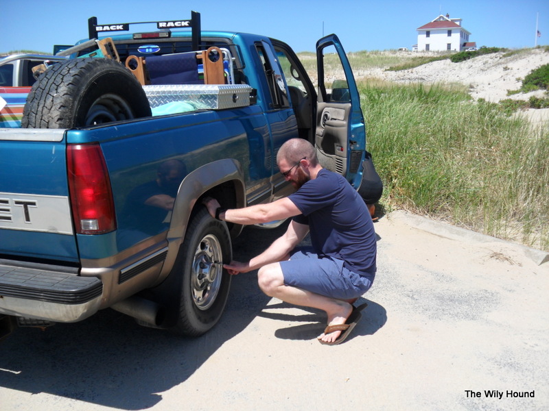 So that’s what we did. We piled into PJ’s truck and headed over to the beach. As long as you have a permit, you can take your car through the dunes and onto the beach. After a quick stop to let the air out of the tires, we were on our way!