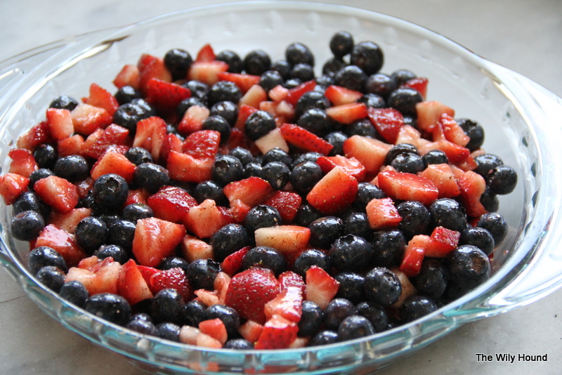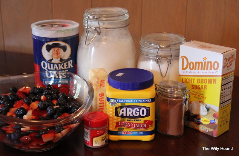 Preheat your oven to 375 degrees. Combine all of the ingredients for the berry mixture and pour into a greased pie dish. Combine the topping ingredients and sprinkle over the top of the berry mixture. Bake for 35-40 minutes or until the top is lightly browned. Serve warm or chilled, alone or with vanilla ice cream.