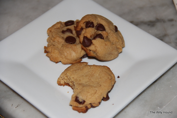 The best part about these cookies (well, aside from the peanut butter and the chocolate…) is that they are lighter than the traditional peanut butter or chocolate chip cookie. They aren’t “healthy,” per se, but they only call for 4 tablespoons of butter (1/2 a stick) where the traditional Nestle Toll House recipe calls for 2 sticks (!) of butter, so they’re not heavy or greasy like cookies can be. One thing to keep in mind is that since they’re not full-fat cookies, they dry out a little quicker than normal treats, so it’s better to eat them within a day or two.