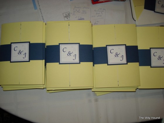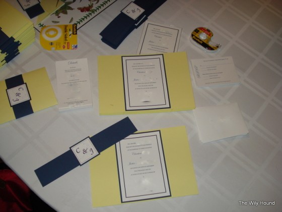 There were a few different pieces to the invites, so there was some assembly required once we got everything in the mail. There was a details card with information about the reception and accommodations, and an RSVP card that was slightly shorter than the details card – that way when they were stacked together, you could see the ‘title’ of each card. We ended up ordering the RSVP envelopes from C&P but we just printed them ourselves on our home printer and they came out great. Once all of the parts were ready, we laid the pieces on top of the invitation, folded up the 2 yellow sides of the pocketfold and slipped the band around the whole thing to hold it together.