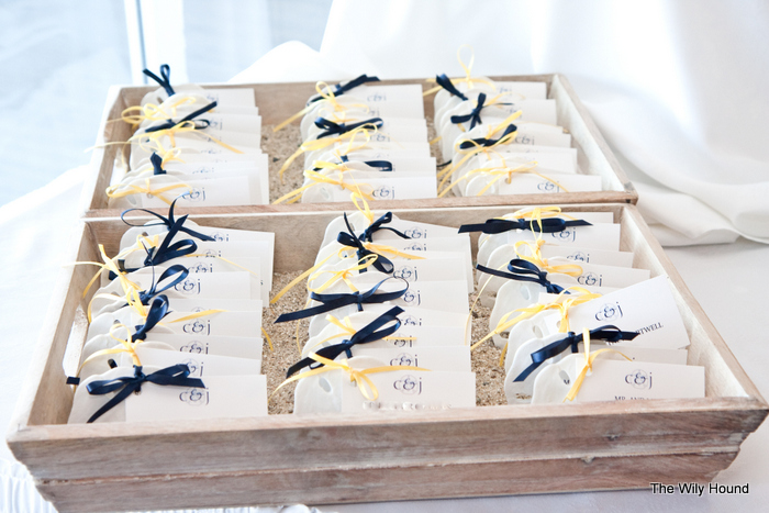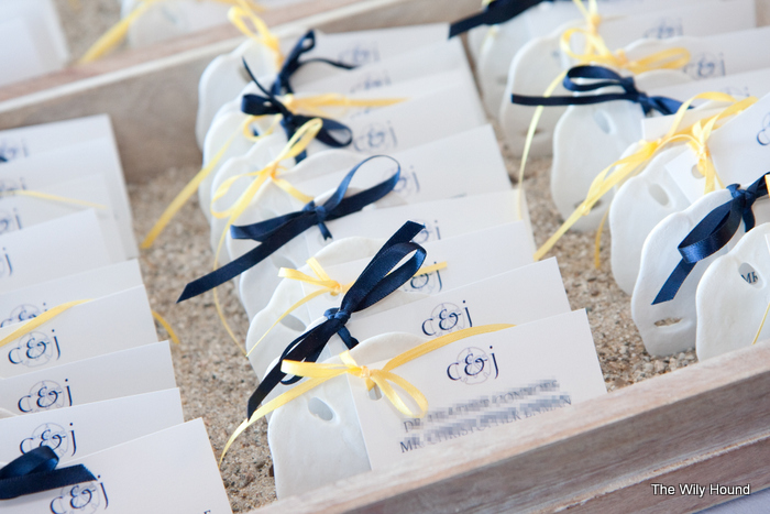 Once the info was all in there, we printed the sheets out, tore along the perforated line, punched a hole in the corner and tied it to a sand dollar with ribbon. The edges were nice and clean and they didn’t look like they had come from a sheet. We then filled a wooden tray with sand and stood the sand dollars up so that guests could find their names when they arrived to the reception.