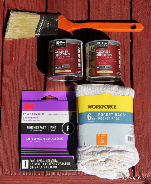I explained to the gentleman at the paint counter what I had in mind and he estimated that I could get both chairs done with a couple of sample-sized cans of deck stain – that way I wouldn’t have to buy a giant can of stain and just have it sitting unused in the basement. I decided to go with a nice, rich reddish stain color called Russet from the Behr Premium Weather Proofing line; it looks pretty brown in the can but it has a great red tint once its on the wood.