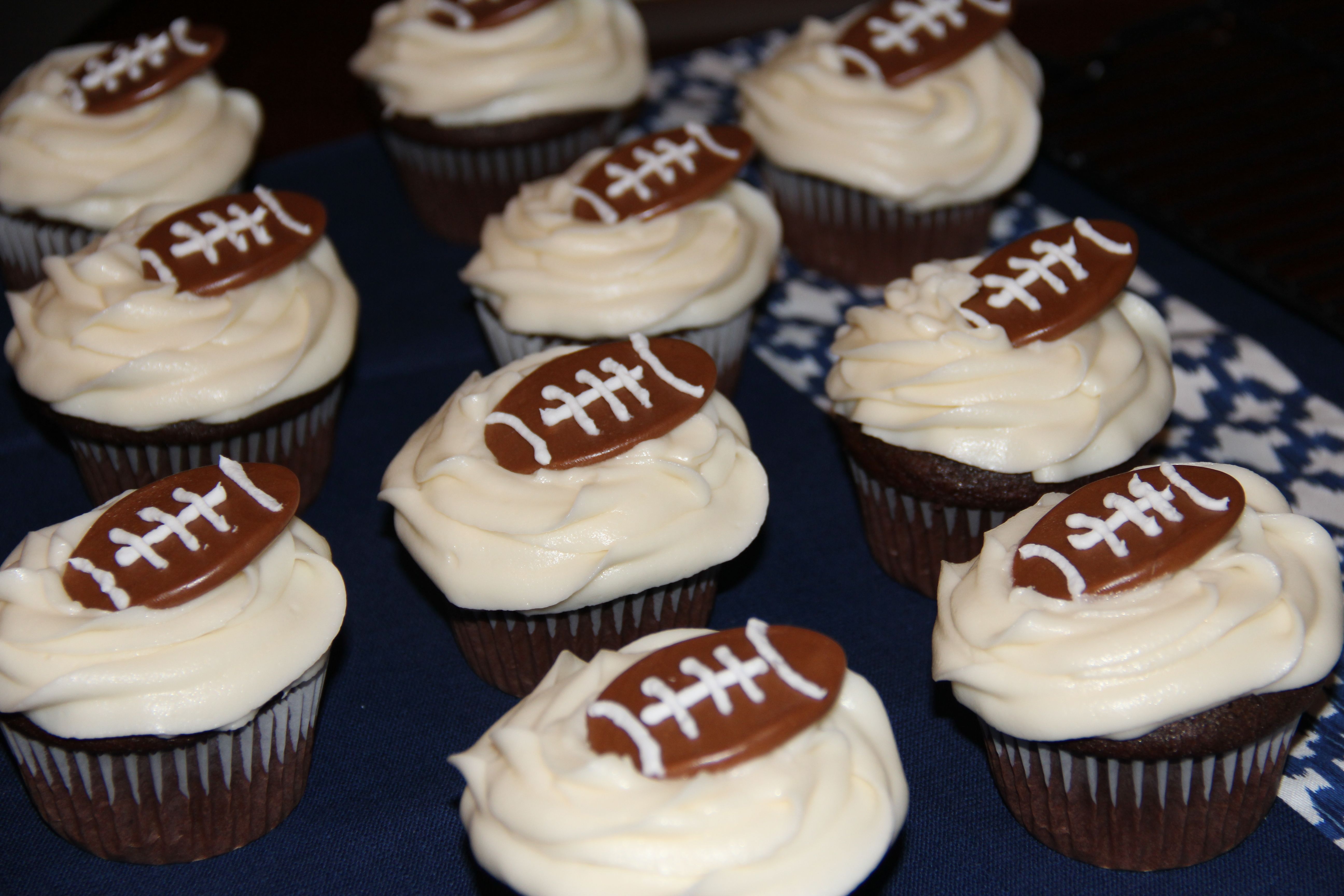 In honor of the Superbowl yesterday, I decided to jazz up the ol’ tried and true chocolate cupcakes with some football paraphernalia. I was hoping that these would be celebratory treats but it just didn’t work out that way. Poor Pats…
