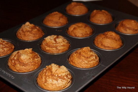 I mixed everything by hand and the result was a pretty heavy batter. I had muffins in mind since they’re easier to grab in the morning on the way out the door, so I lightly greased some muffin tins and filled them about 3/4 of the way.