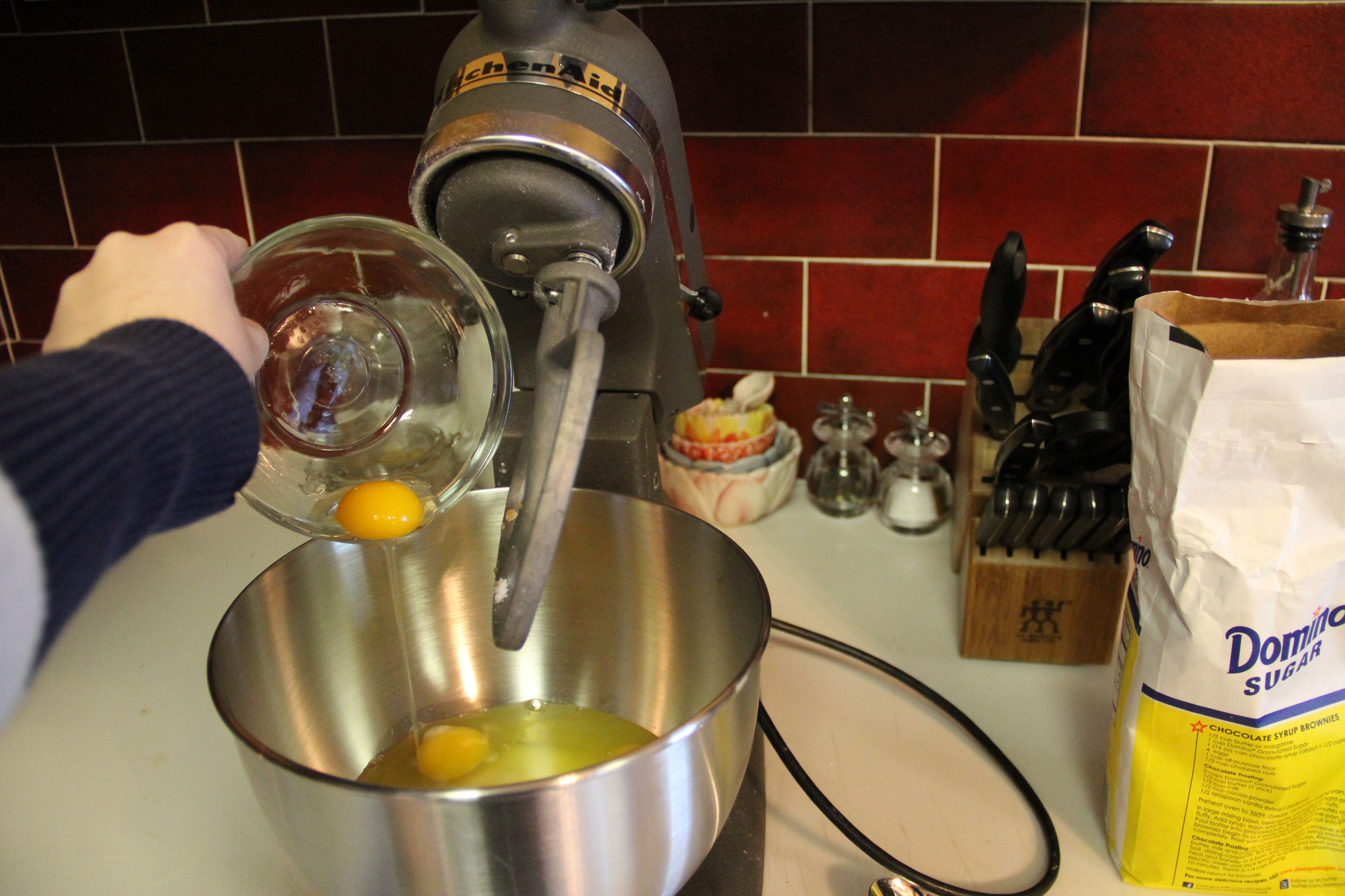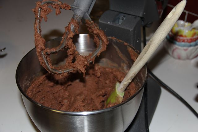 Slowly stir in the dry ingredients into the sugar mixture until combined. I was originally going to mix the dry ingredients in by hand (which is why the bowl isn’t on the electric mixer anymore) but the batter was thicker than a normal brownie batter, so back onto the mixer it went!