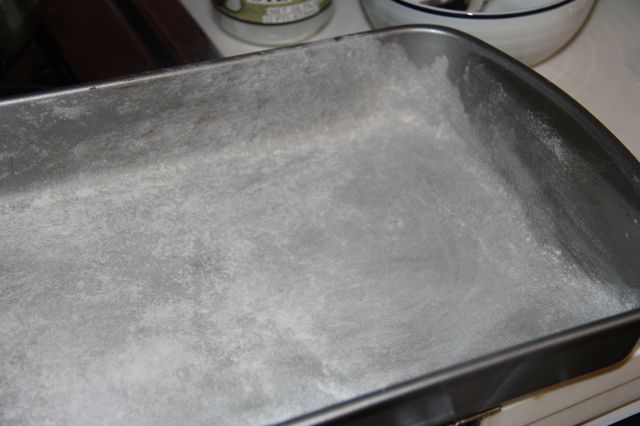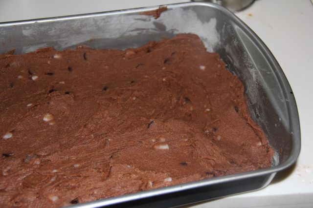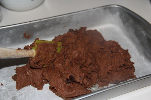 Turn the batter into the pan. It’s really thick so you’ll have to work with it to spread it out.