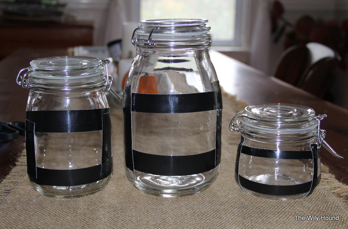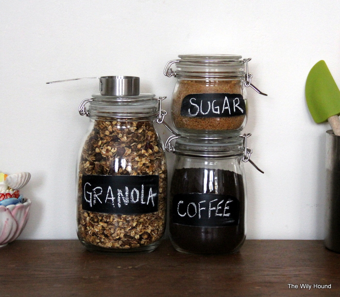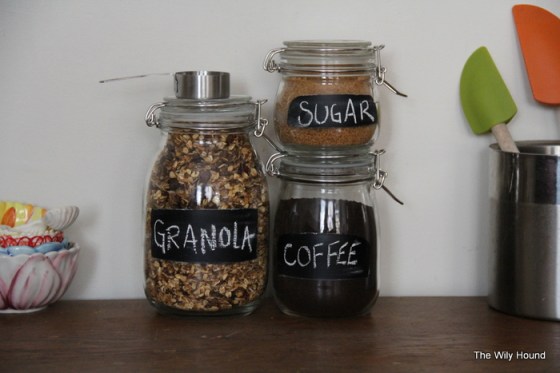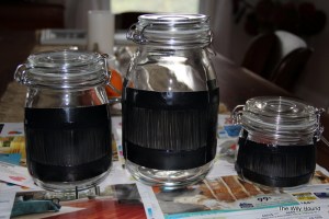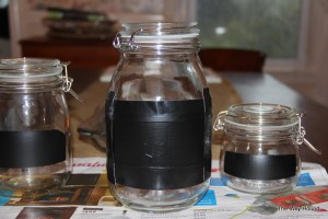 So, as one does when one finds oneself faced with a craft conundrum, I turned to Pinterest. A quick ‘chalkboard paint’ search yielded a bunch of great ideas and I found myself drawn to the storage containers. I had some jars lying around and I liked the idea of being able to switch up the label when necessary without having to permanently scar a container with a marker or deal with scraping off tape residue.