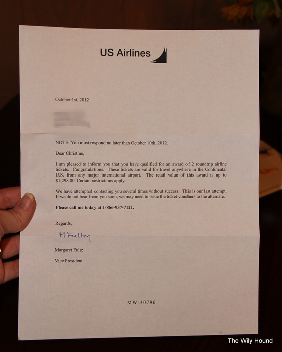 We’re cutting it pretty close here; I have to reply by today and I just got it in the mail yesterday – I guess it’s my own fault for being so hard to track down. This is their last attempt to contact me so I had better get on the ball. I was surprised to see that the letter was delivered in a handwritten envelope with no return address. I think it’s really nice that a big company like US Airlines would take the time to hand write my information. Really personal, you know? It’s going to be tough to send them a thank you letter without a return address to reference, but I’ll figure it out.